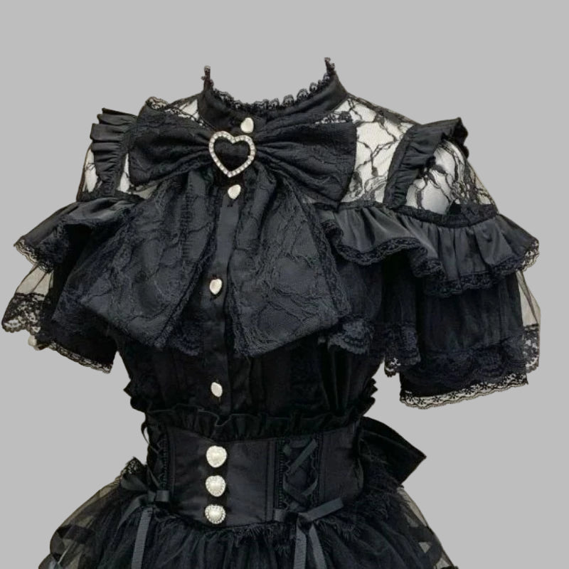 Blusa Gótica Preta de Renda com Laço e Cinta Corset