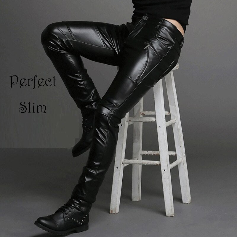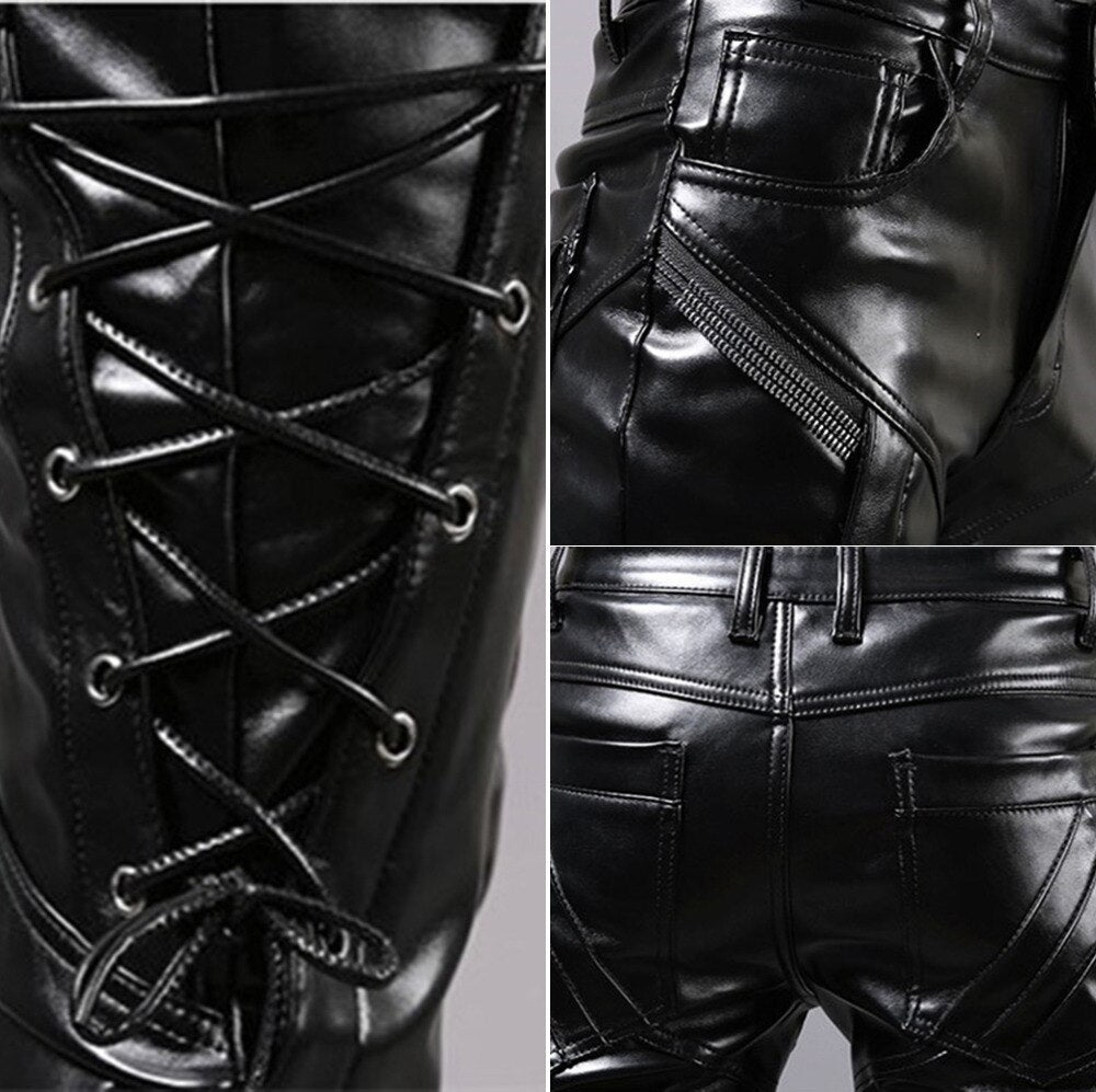 Calças de Couro Masculinas Rock Metal Preto Luz
