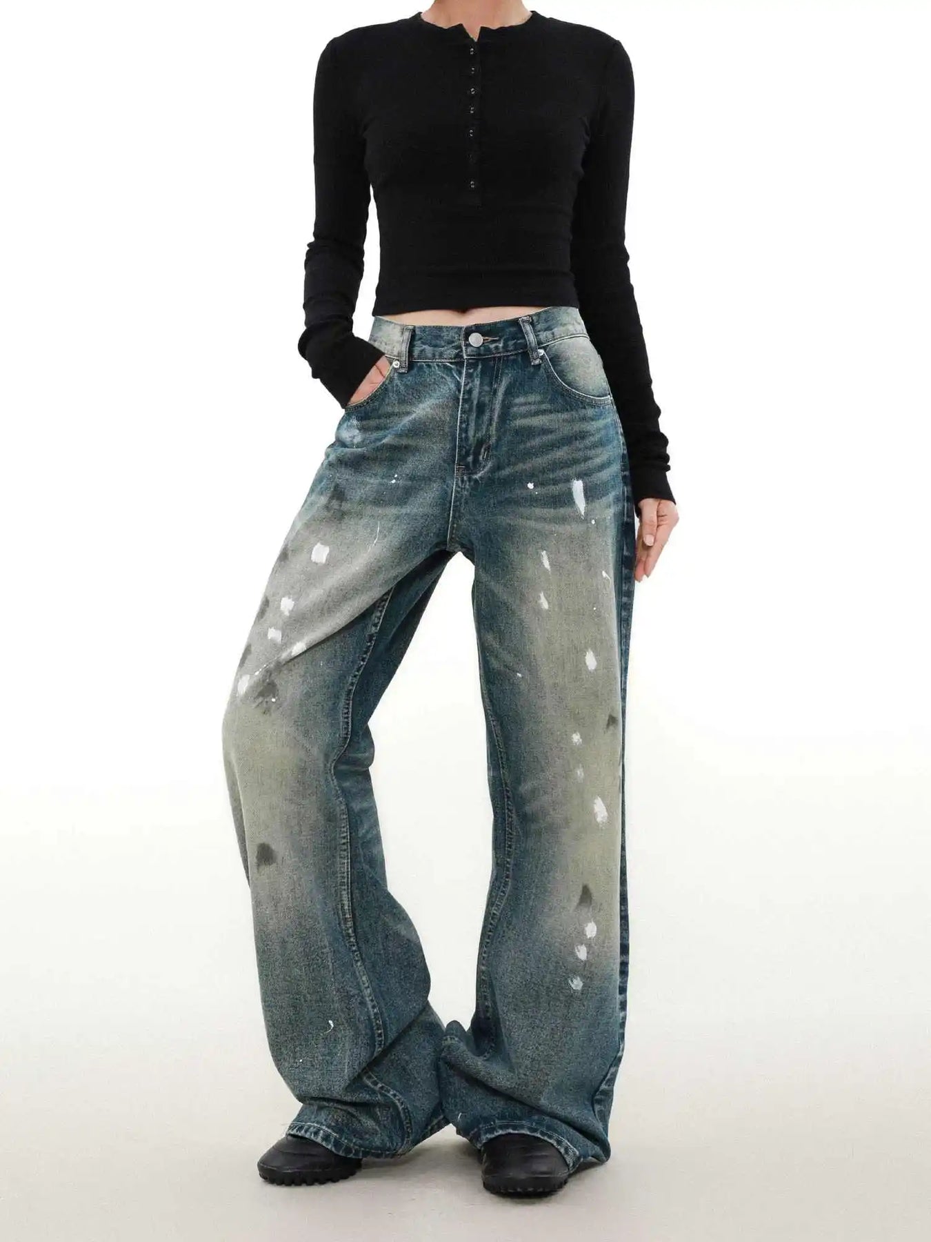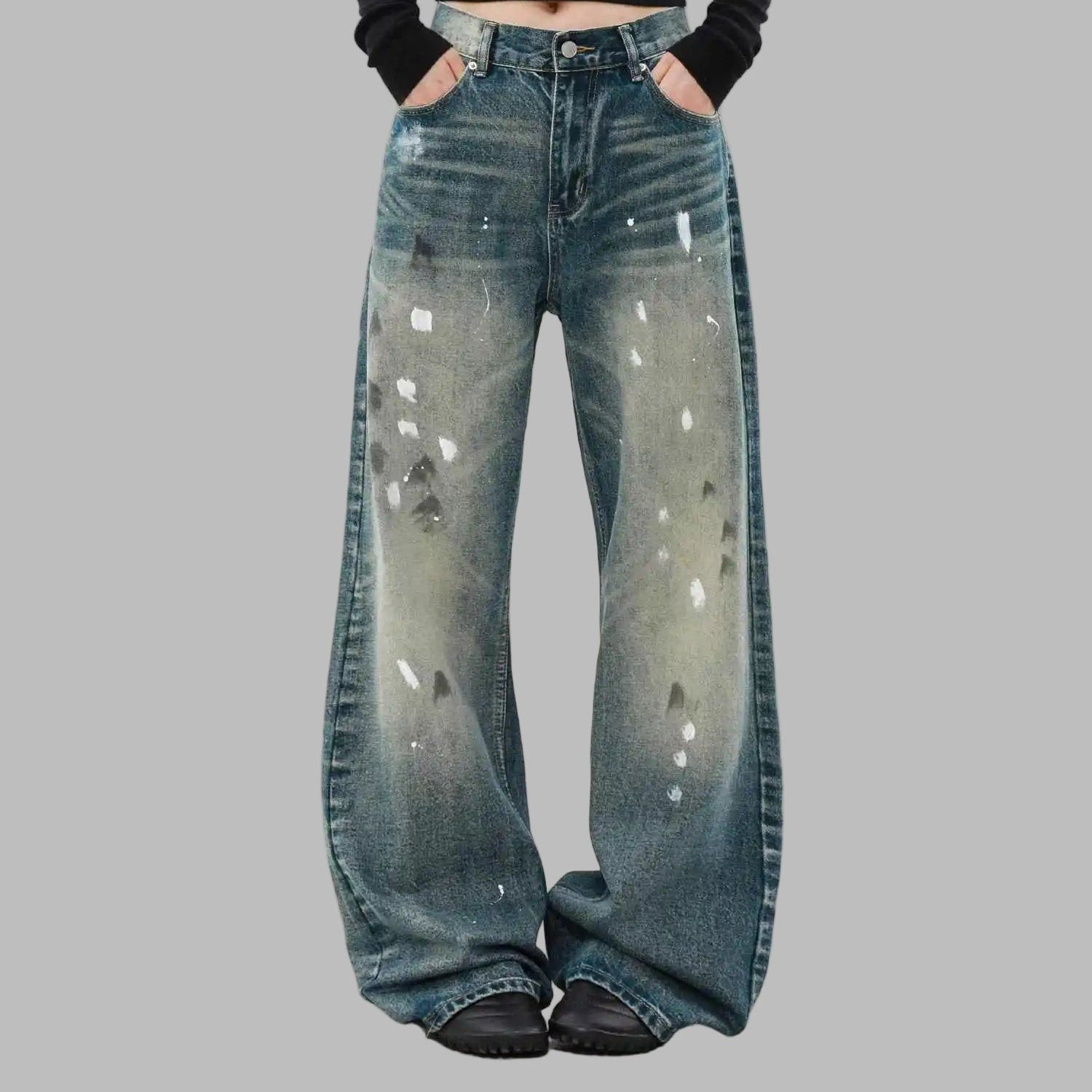 Calças de Ganga Largas Azuis com Manchas Desgastadas Femininas Grunge