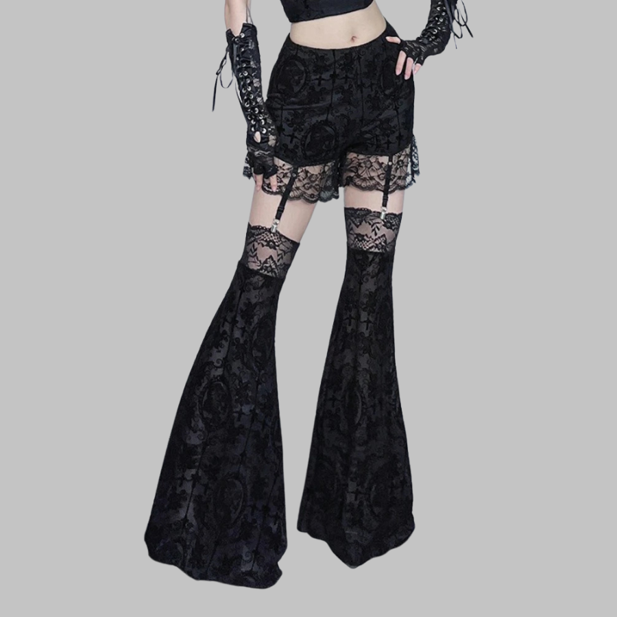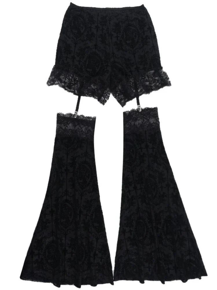 Calças Flare Góticas Pretas de Renda com Saia Curta