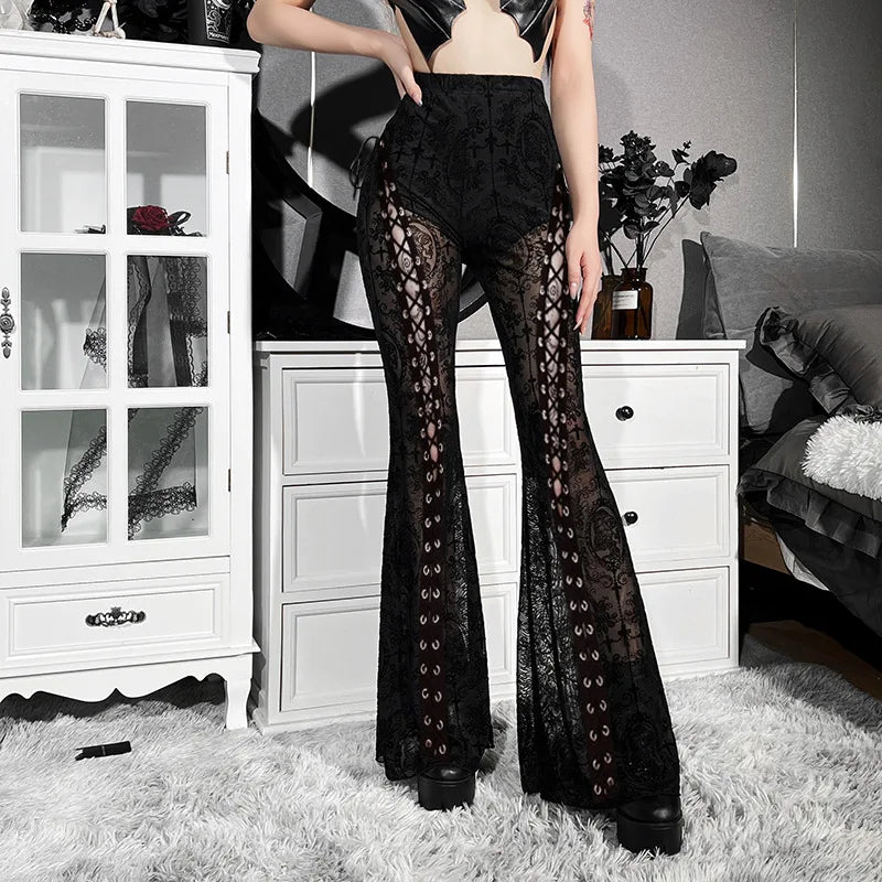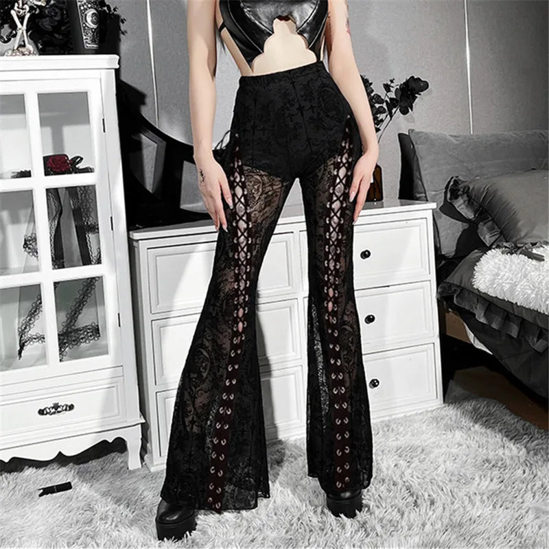 Calças Góticas Alargadas de Renda Preta – Estilo Dark Mall