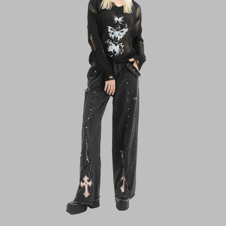 Calças Largas Góticas Punk em Denim com Cruzetas e Tachas