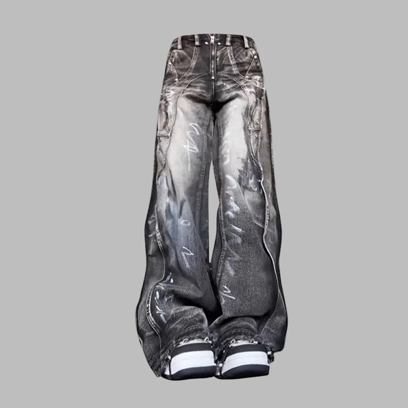 Calças Oversize Pretas Jeans Grunge com Estampas Largas Unissexo