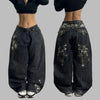 Calças Pretas Punk Rock com Bordados de Plantas Grunge