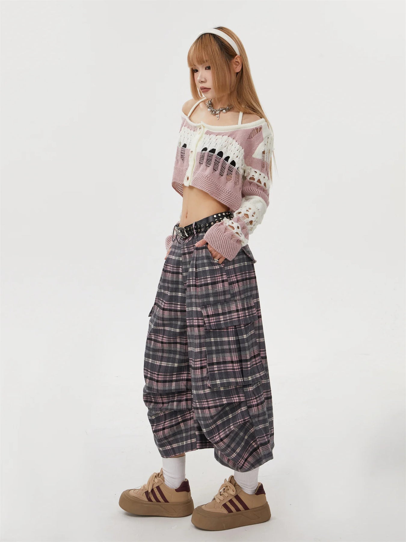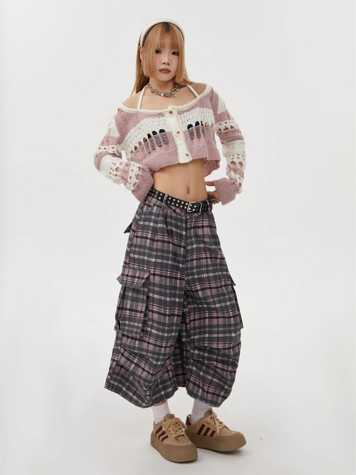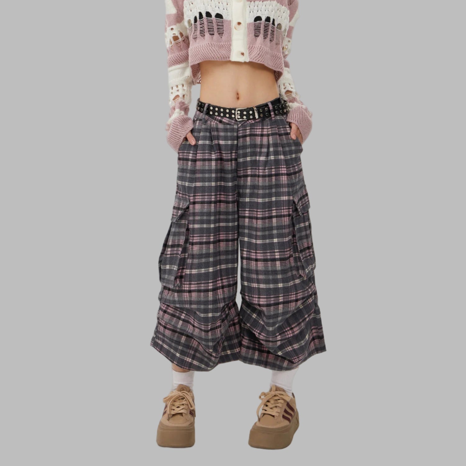 Calças Punk Rock Xadrez com Renda Cinza-Rosa