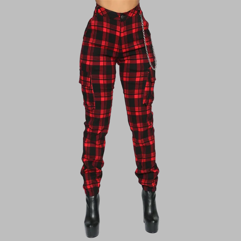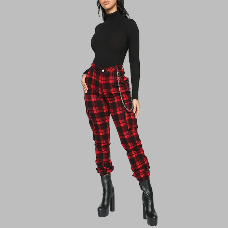 Calças Punk Xadrez Vermelho Preto com Corrente Justas