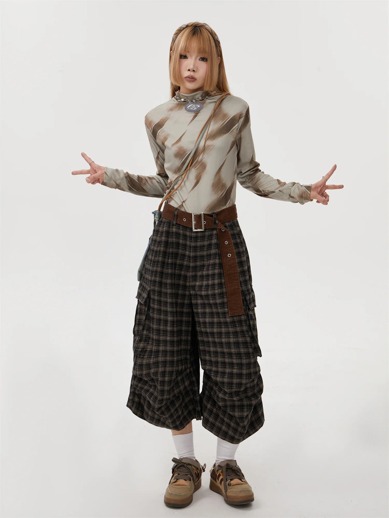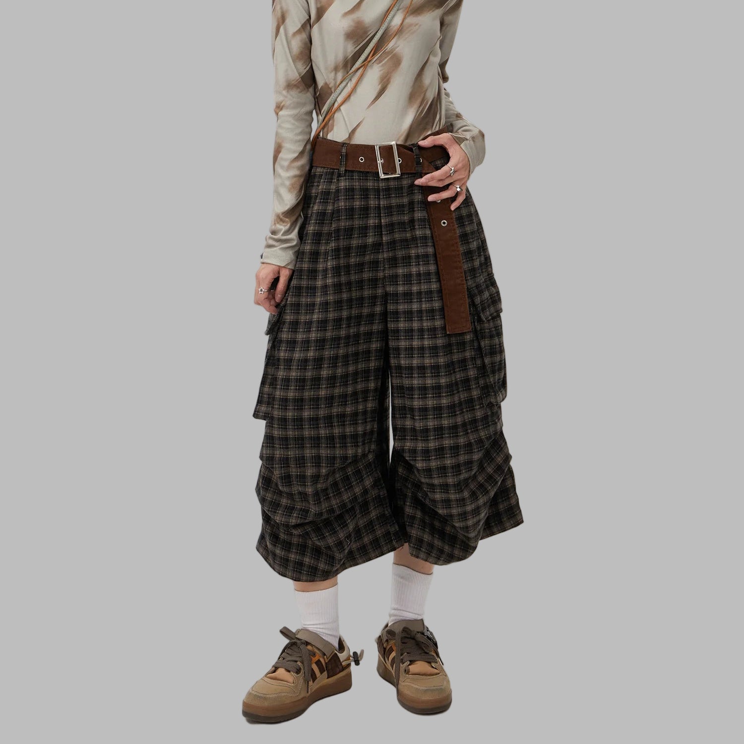 Calças Steampunk Vintage Xadrez com Cinto Khaki