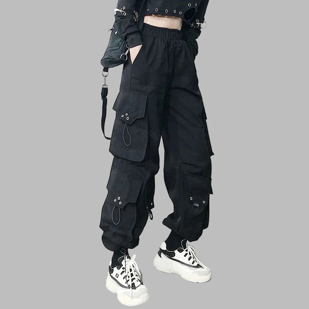 Calças Táticas Punk Pretas com Bolsos e Correntes Grunge