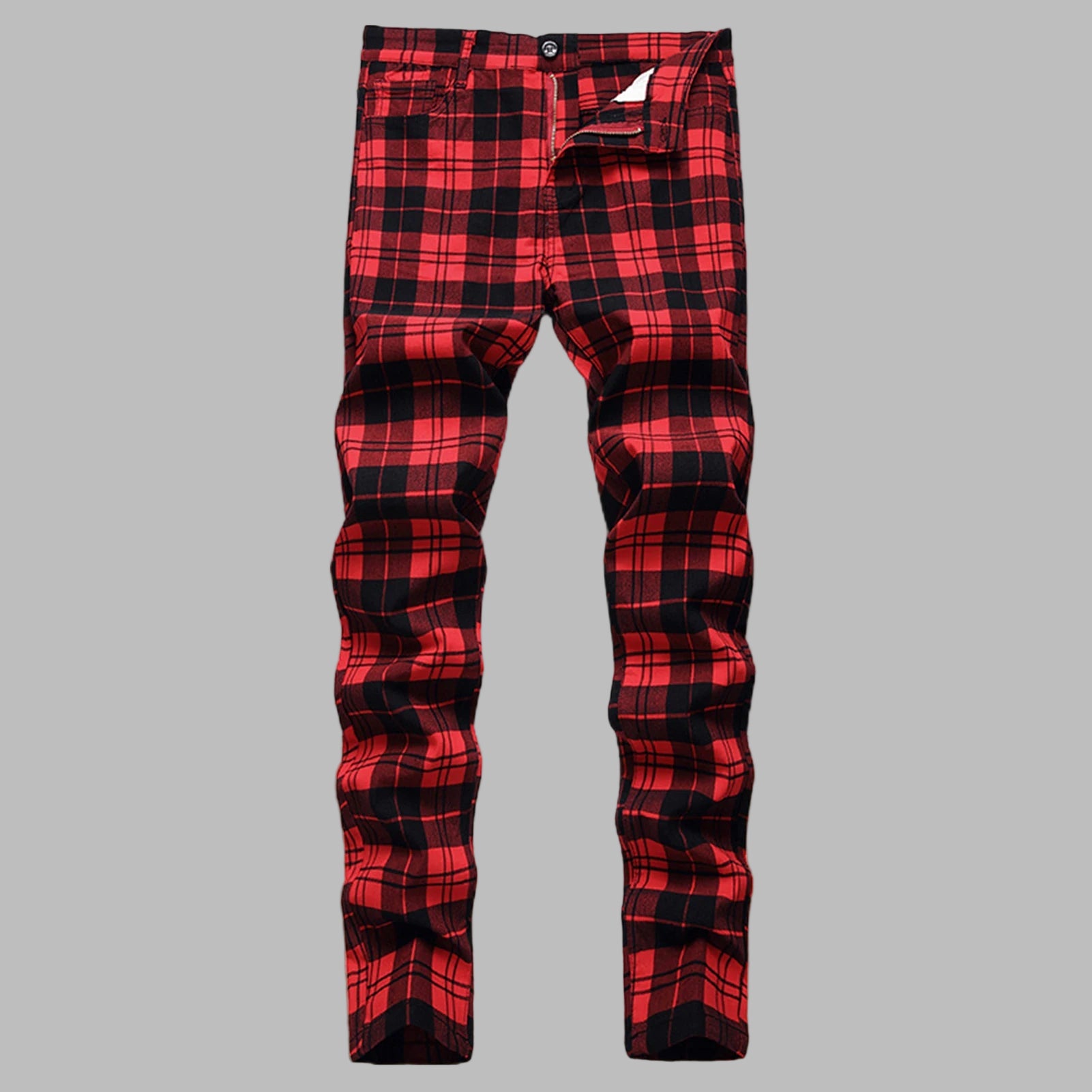 Calças Vintage Rock Xadrez Vermelho-Preto Metal