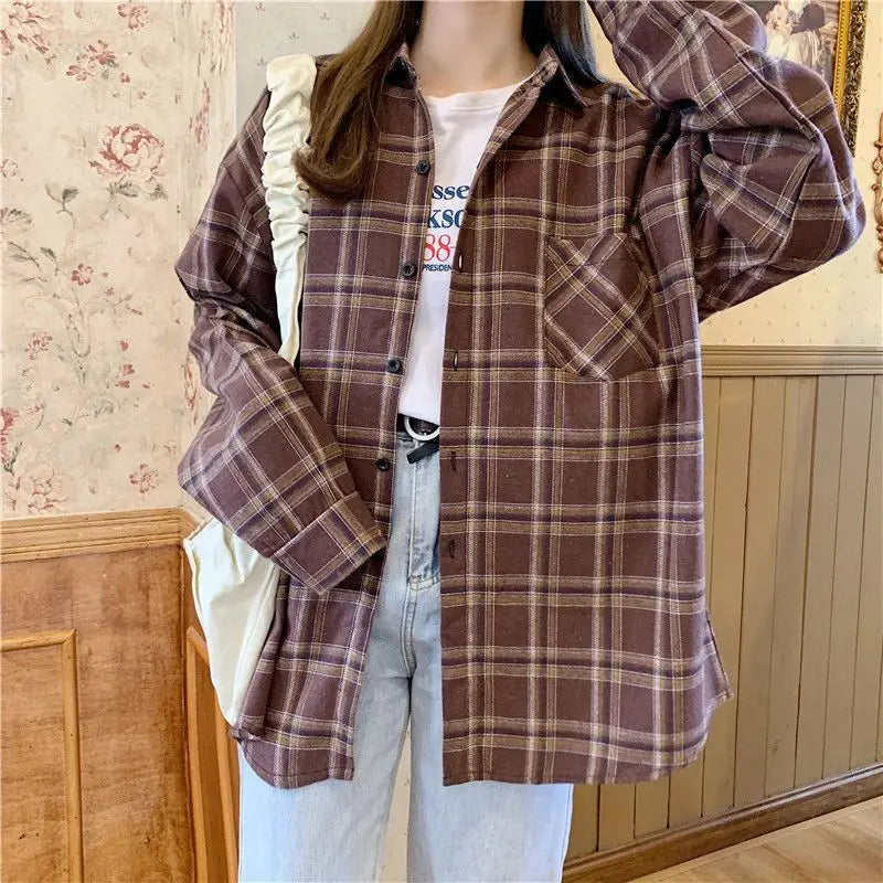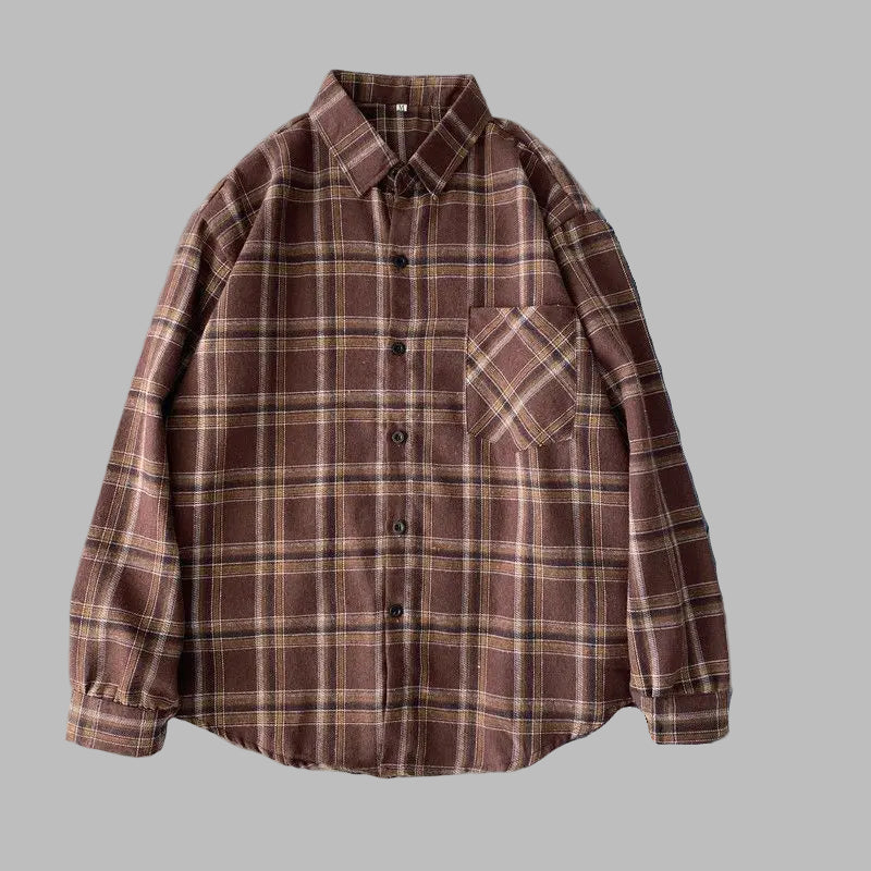 Camisa de Flanela Castanha aos Quadrados Punk Rock com Bolso