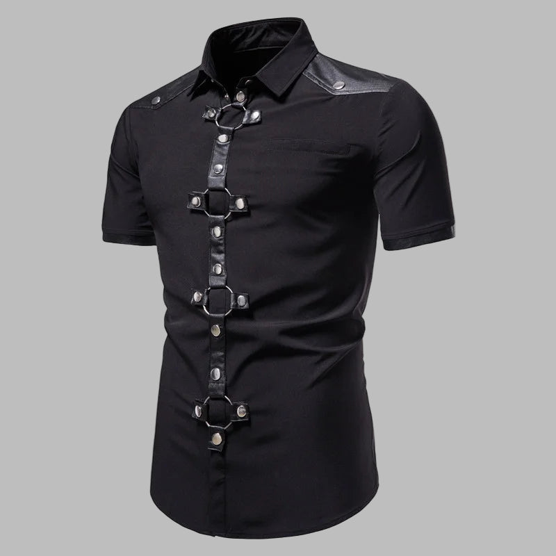 Camisa Punk Preta com Argolas Metálicas e Tiras de Manga Curta