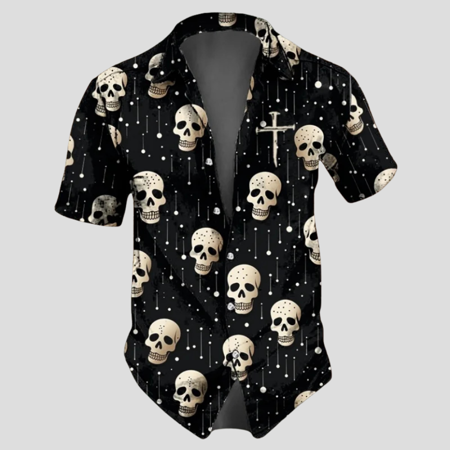 Camisa Punk Preta com Caveiras e Cruzes Manga Curta