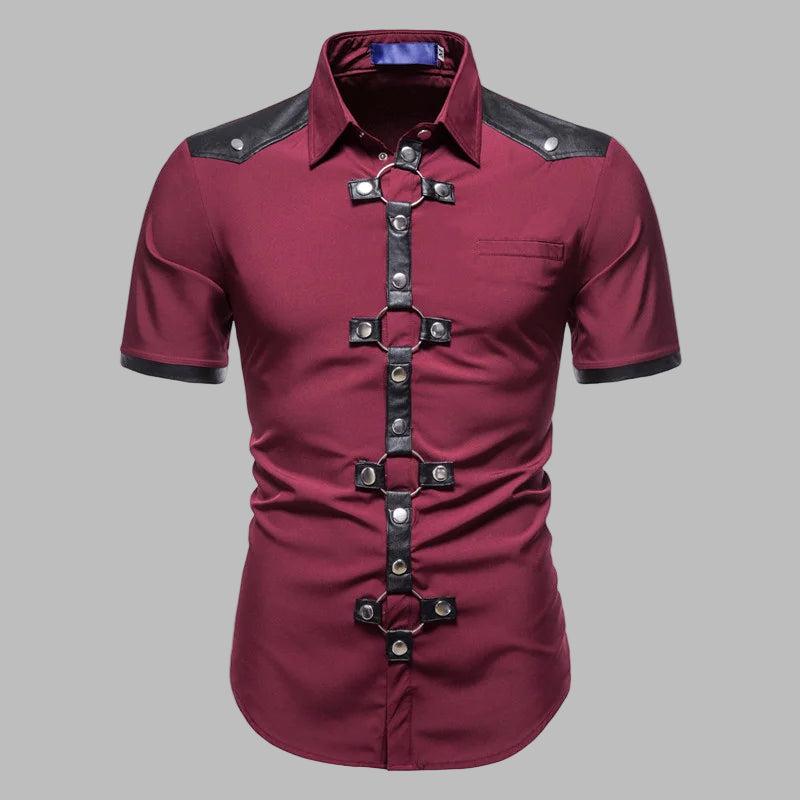 Camisa Steampunk com Tiras de Couro Bordô Manga Curta