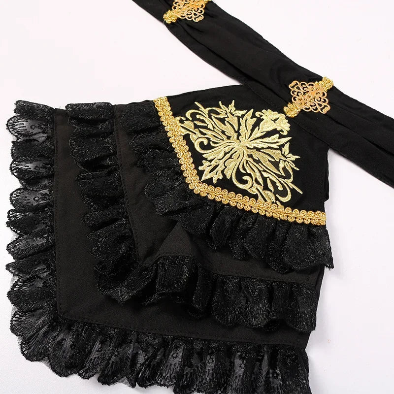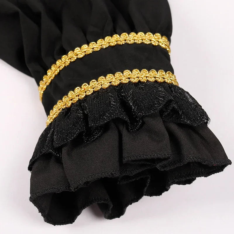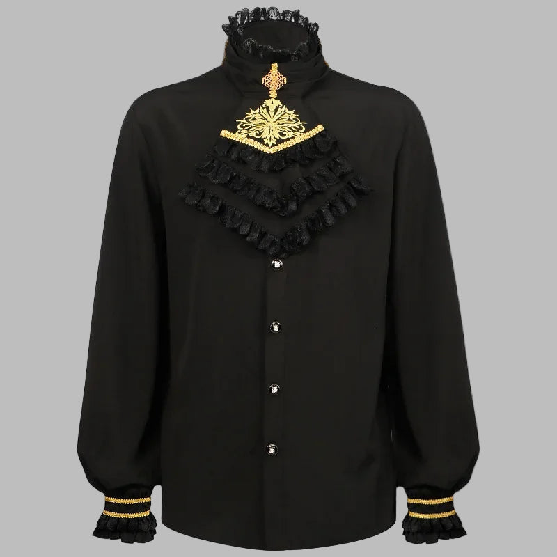 Camisa Steampunk Preta com Renda e Apliques Dourados
