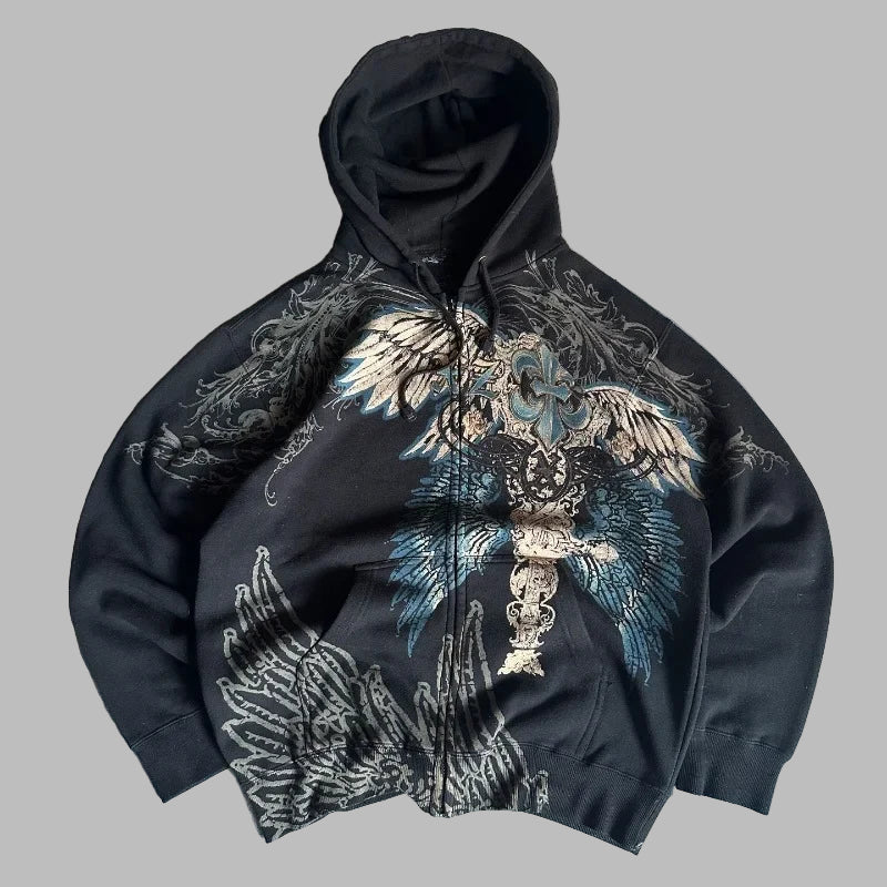 Sweatshirt preta com estampado de asas e caveiras estilo metal