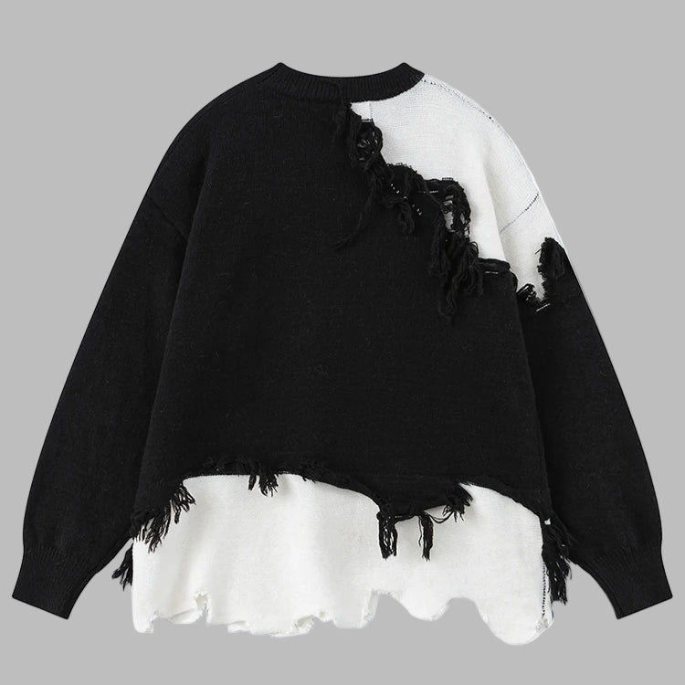 Camisola Punk Preto e Branco com Rasgões e Franjas