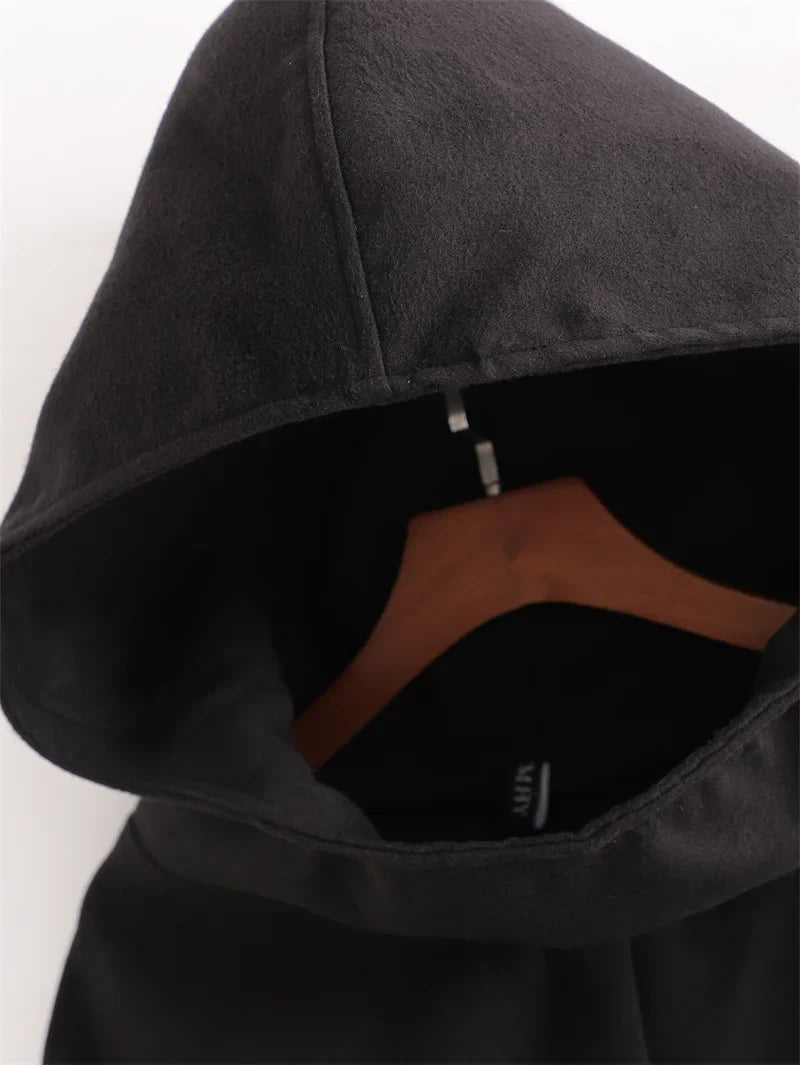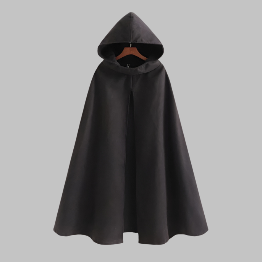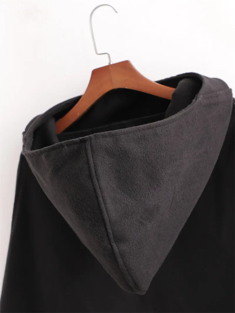 Capa Preta com Capuz de Comprimento Médio – Estilo Feminino de Bruxa