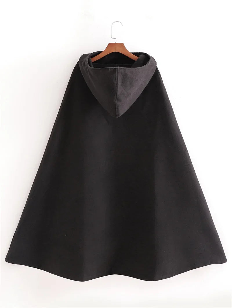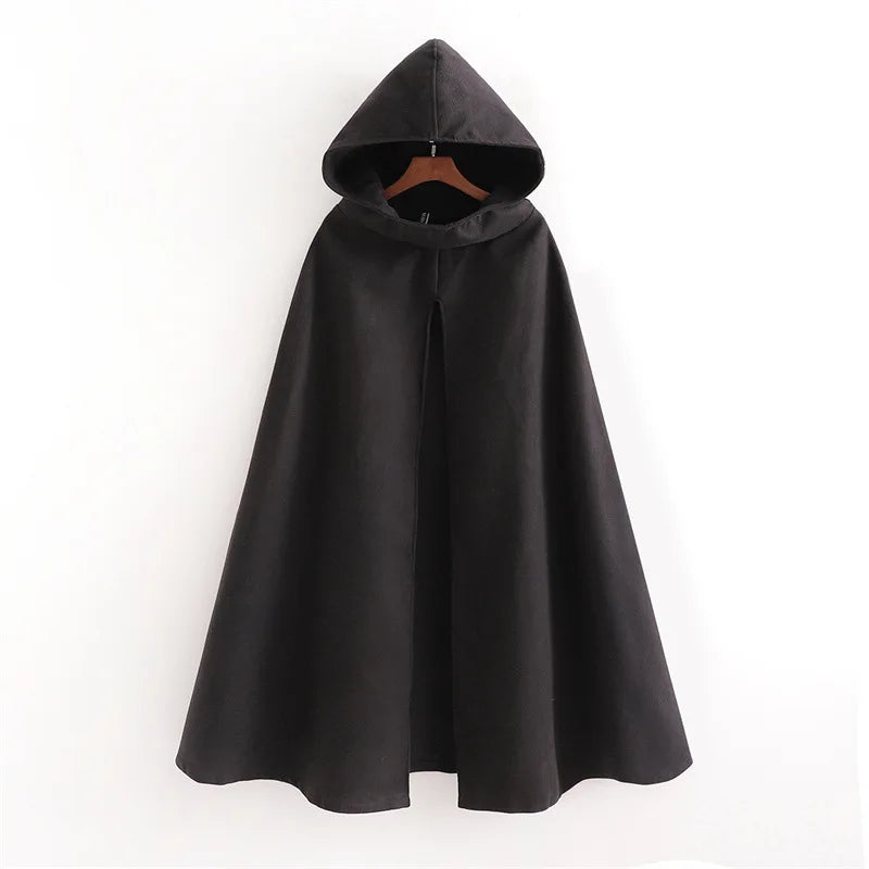 Capa Preta de Comprimento Médio com Capuz – Estilo Bruxa Feminino