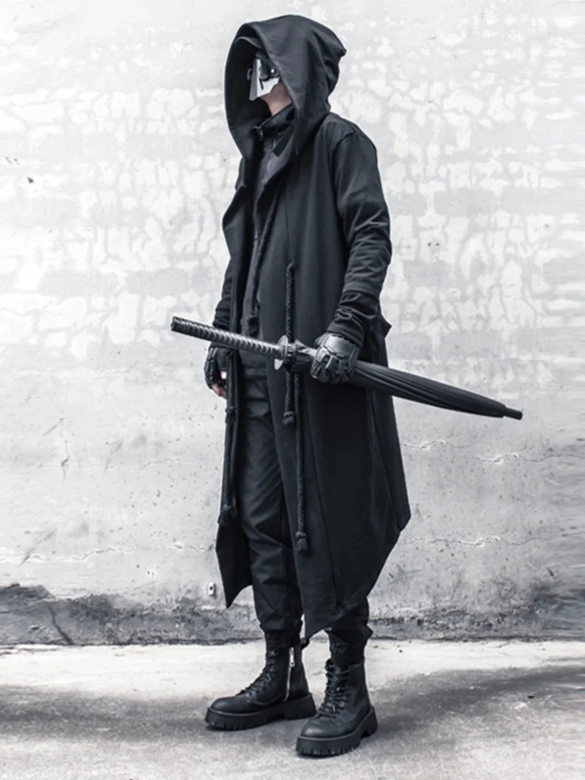 Casaco Comprido Preto com Capuz para Homem – Estilo Techwear 6XL
