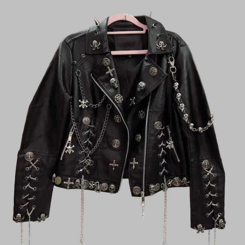 Casaco de Pele Gótico Preto com Tachas Correntes Cruzes para Mulher Ver opcoes