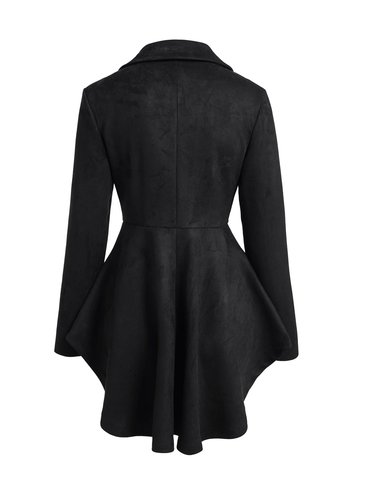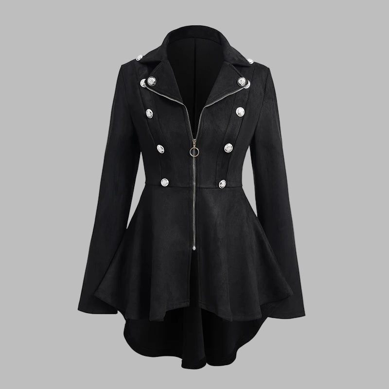 Casaco feminino gótico preto evasé, botões e fecho éclair