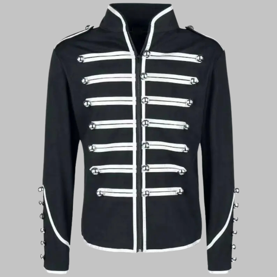 Immerge-te no mundo retro-futurista com este casaco masculino inspirado no estilo steampunk e gótico. Com gola alta, botões decorativos e elegante patchwork, é perfeito para festas temáticas, bailes de máscaras, concertos ou simplesmente como um elemento original do vestuário diário.