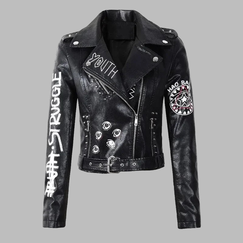 Casaco Punk Gótico de Pele Preto com Tachas e Inscrições Grunge para Mulher Retry