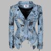 Casaco de Couro Punk Rock Metal Azul com Estampa de Jornal