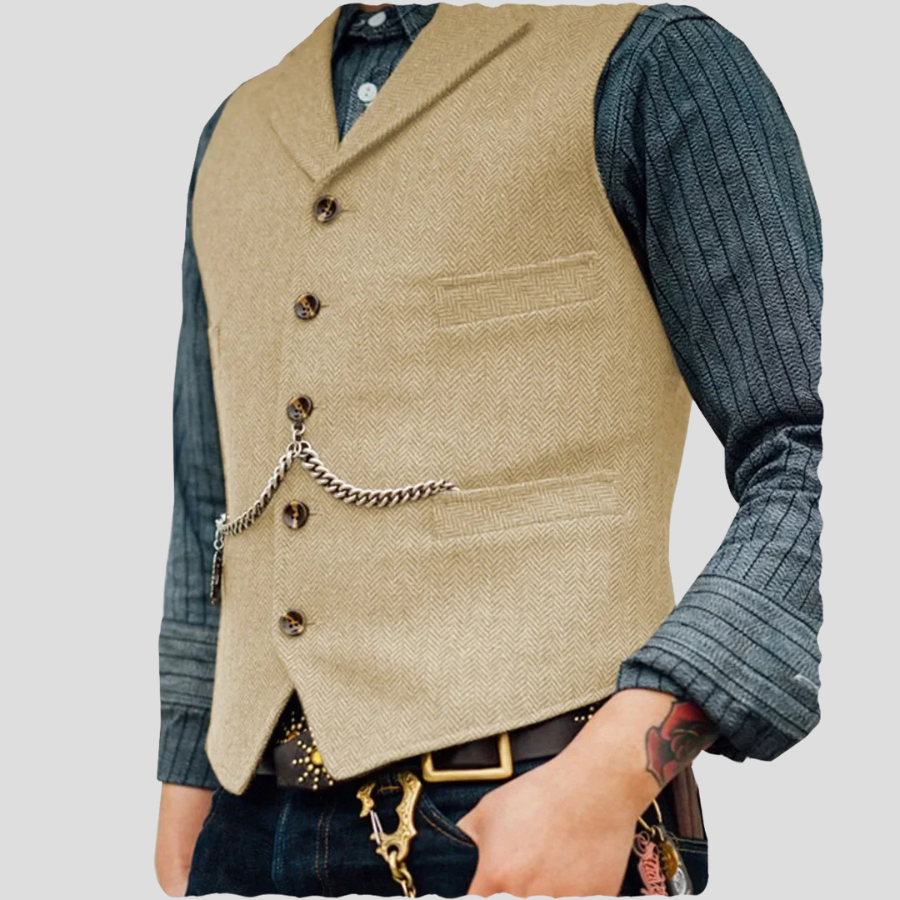 Colete Steampunk Bege com Corrente de Bolso Espinha de Peixe