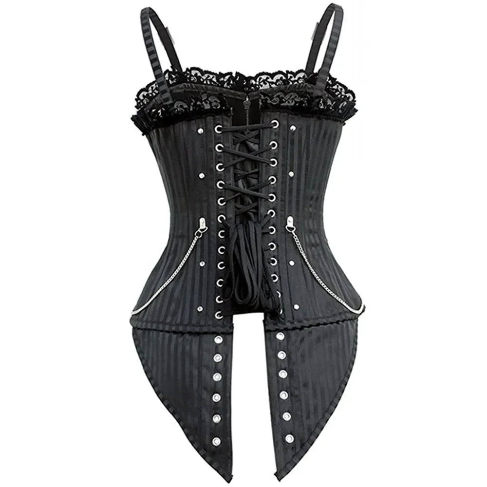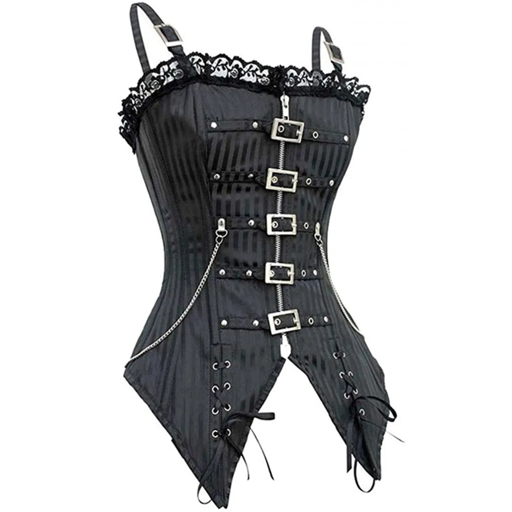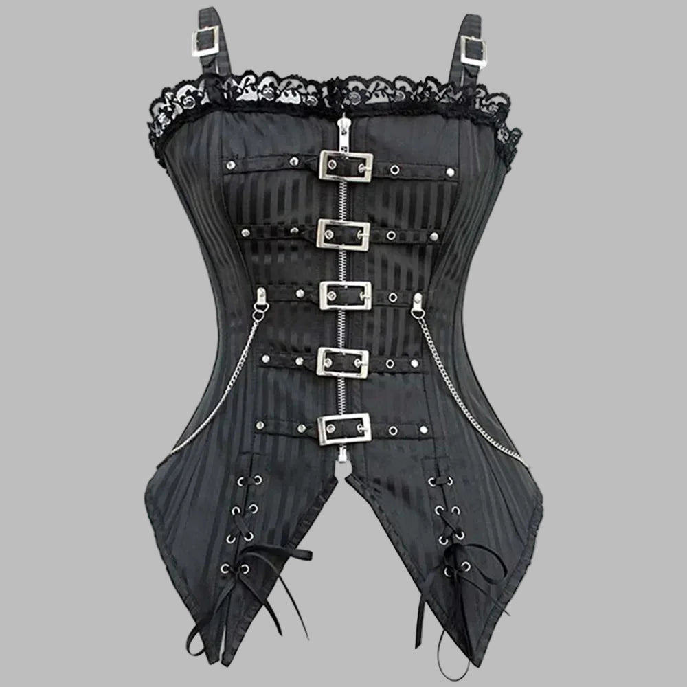 Corselet gótico punk com fivelas, tachas e correntes preto canelado