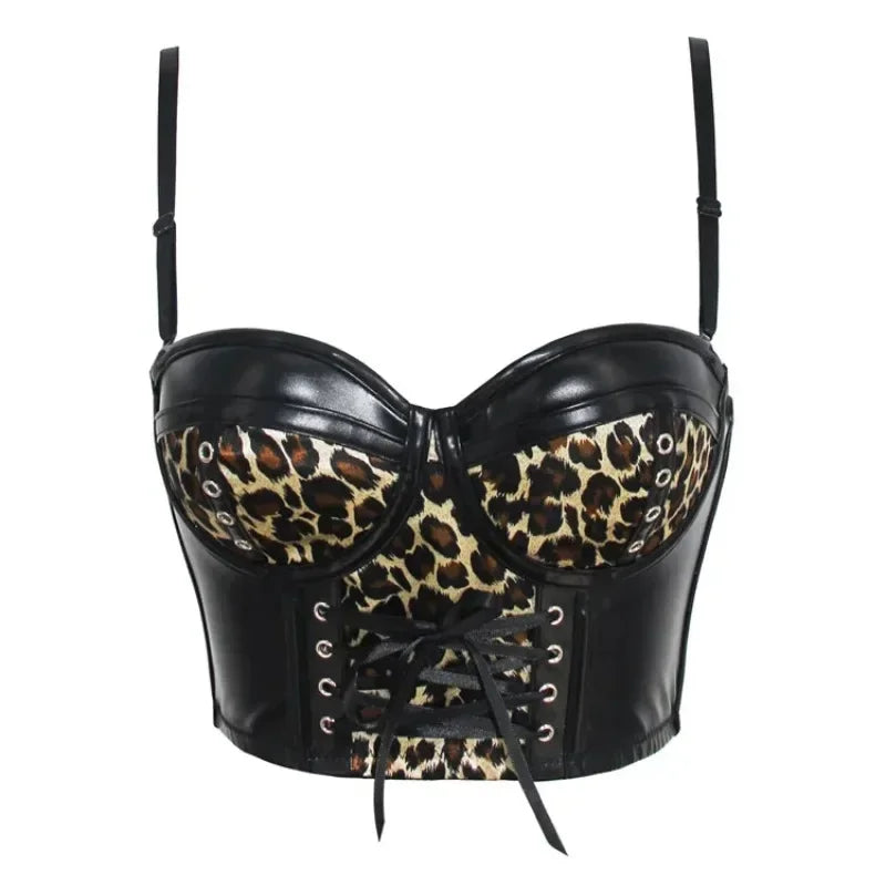 Corselete de Leopardo com Material Preto Imitando Pele e Laço – Estilo Punk Arrojado