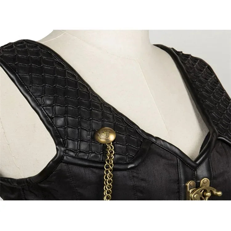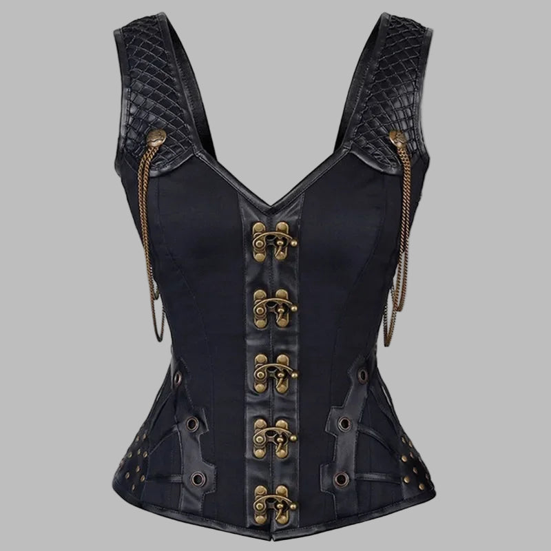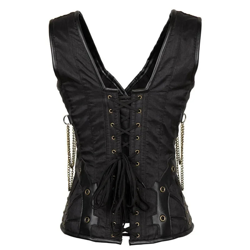 Corselete Gótico Steampunk em Pele com Correntes e Fechos Metálicos Preto