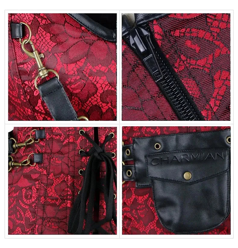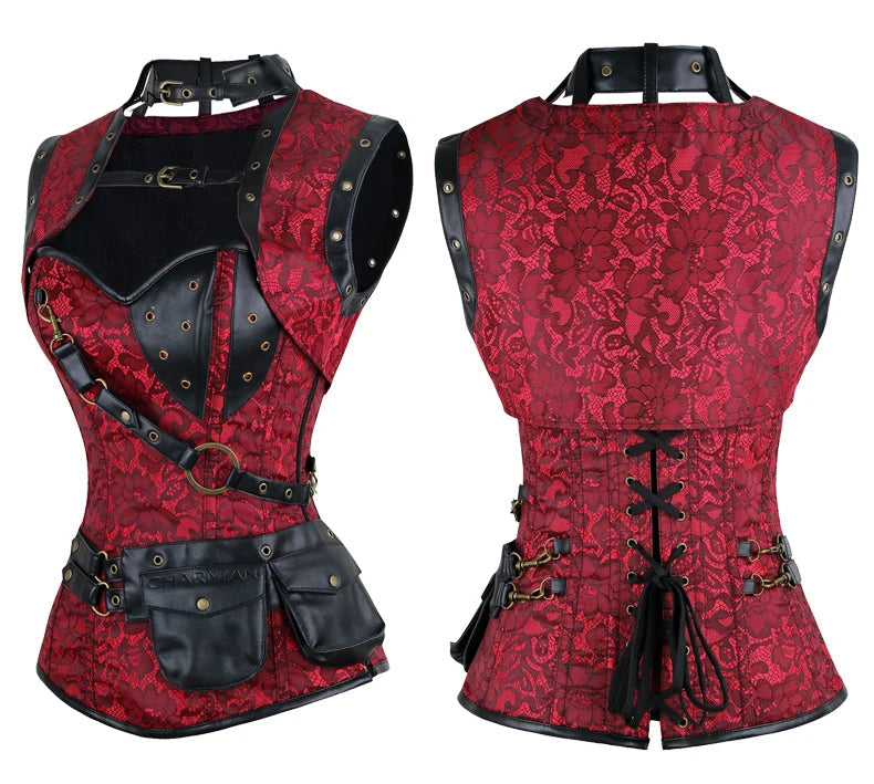Corselete Punk com Rede Vermelha e Caveiras Pretas