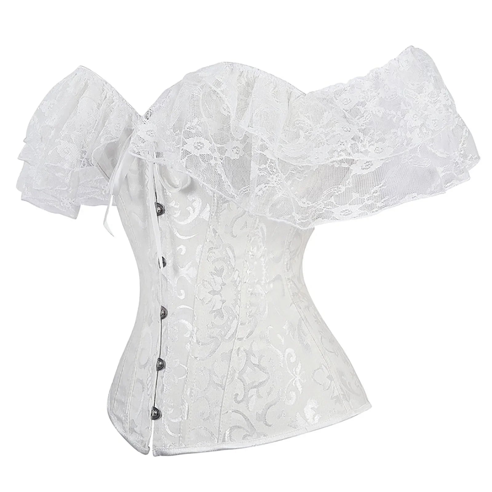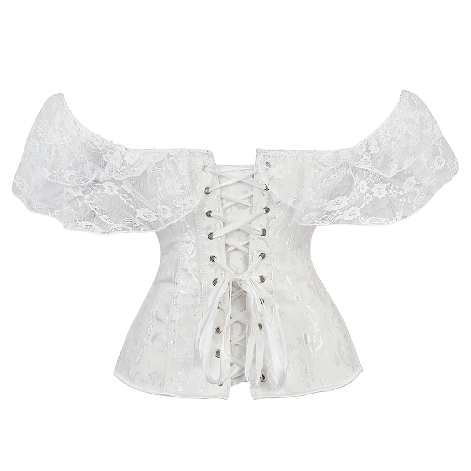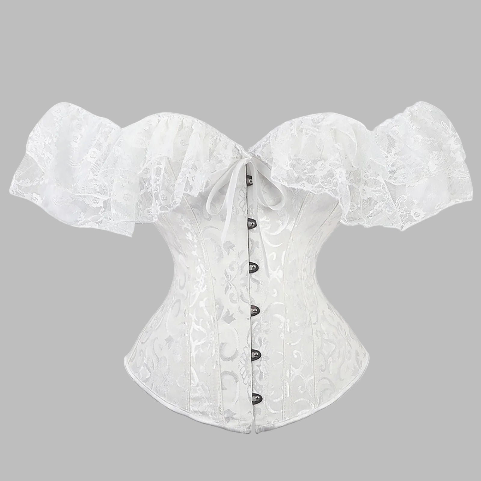 Corselete Steampunk Branco de Renda com Mangas Bufantes e Ganchos Metálicos