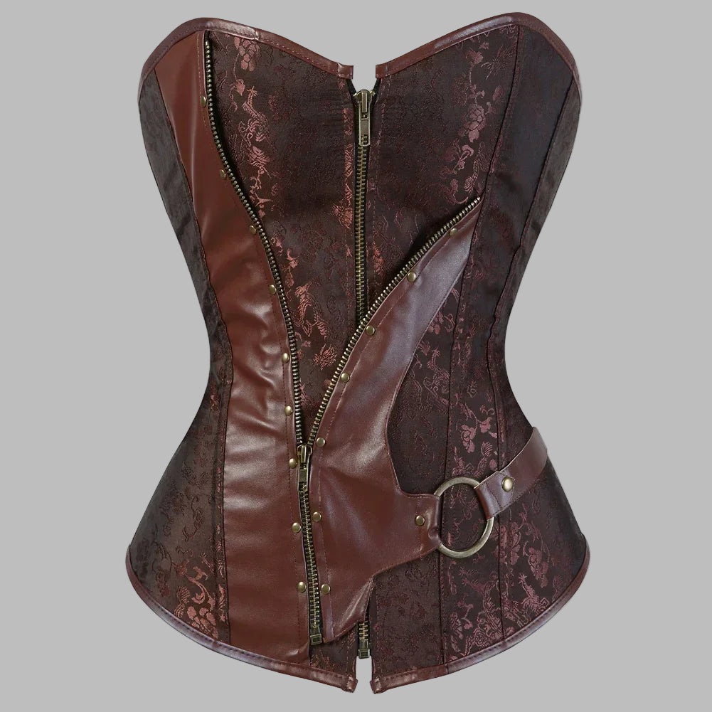 Corselete steampunk castanho de brocado com fecho e cinto com anel