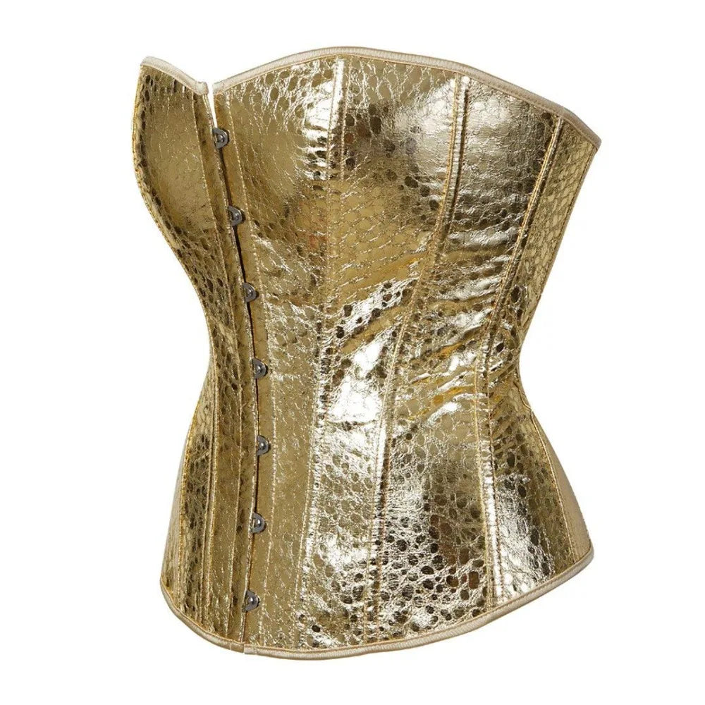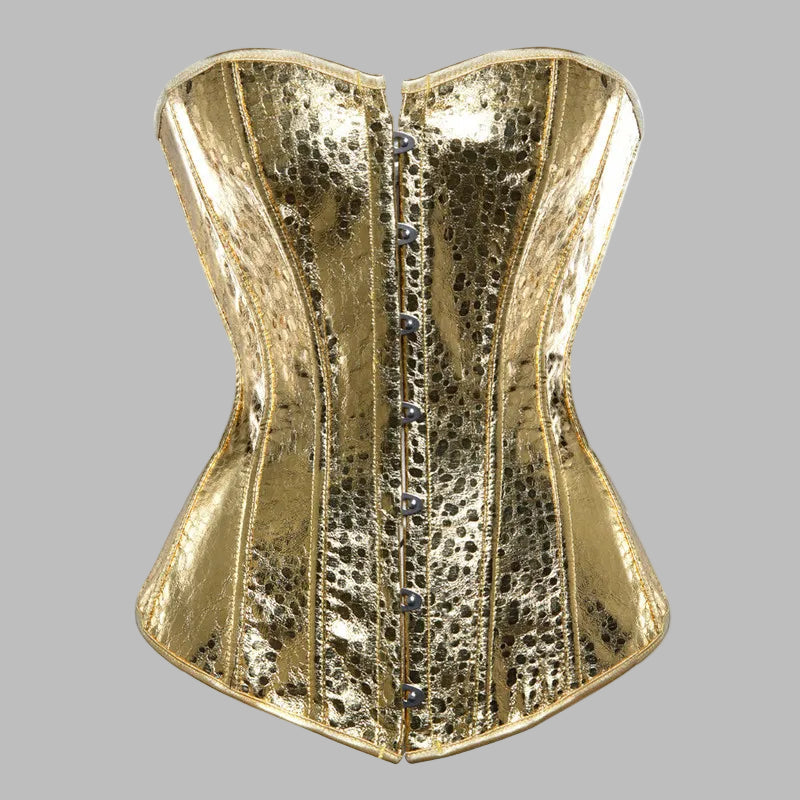 Corselete Steampunk Dourado Metálico com Padrão de Pele de Cobra