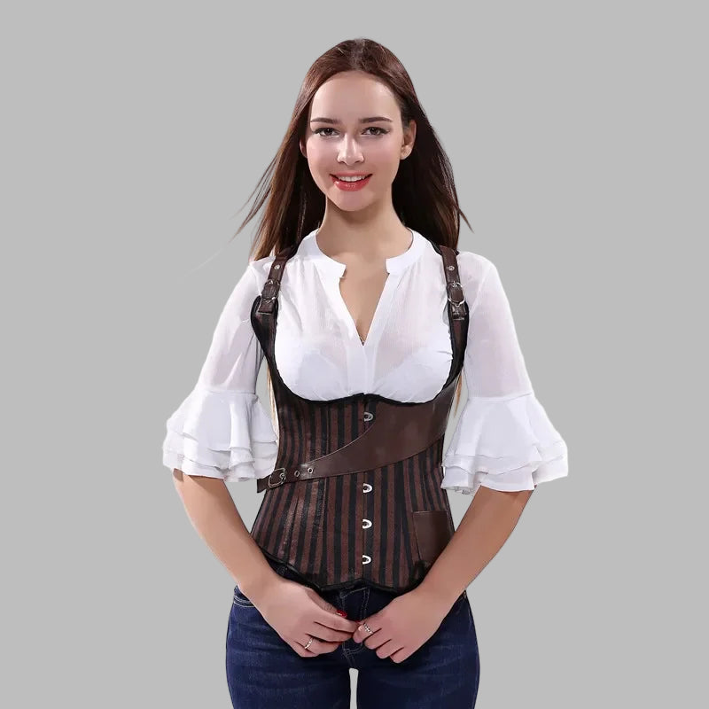 Corselete steampunk gótico castanho e preto às riscas com alças