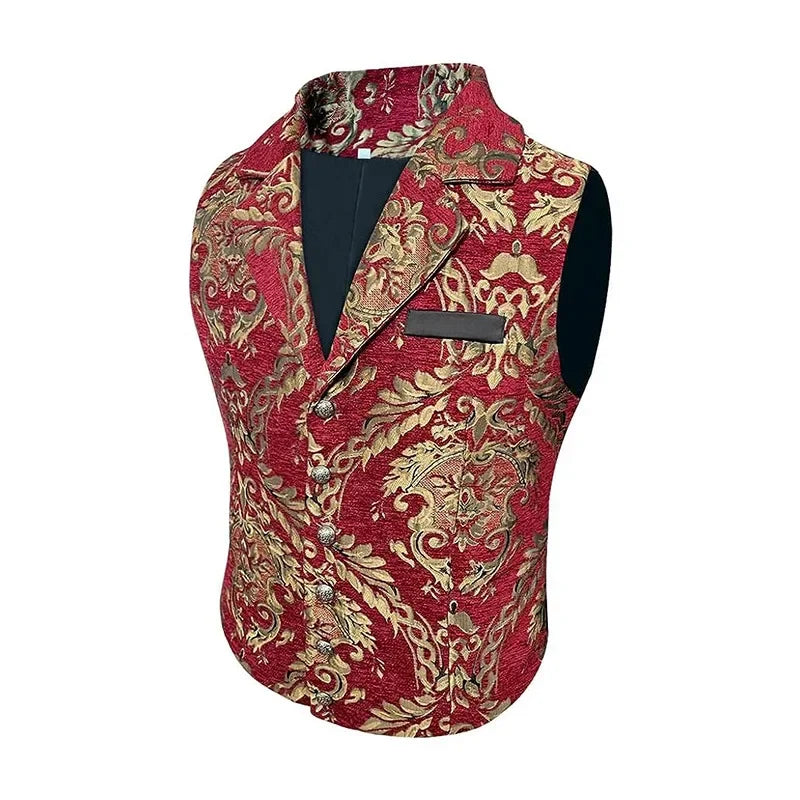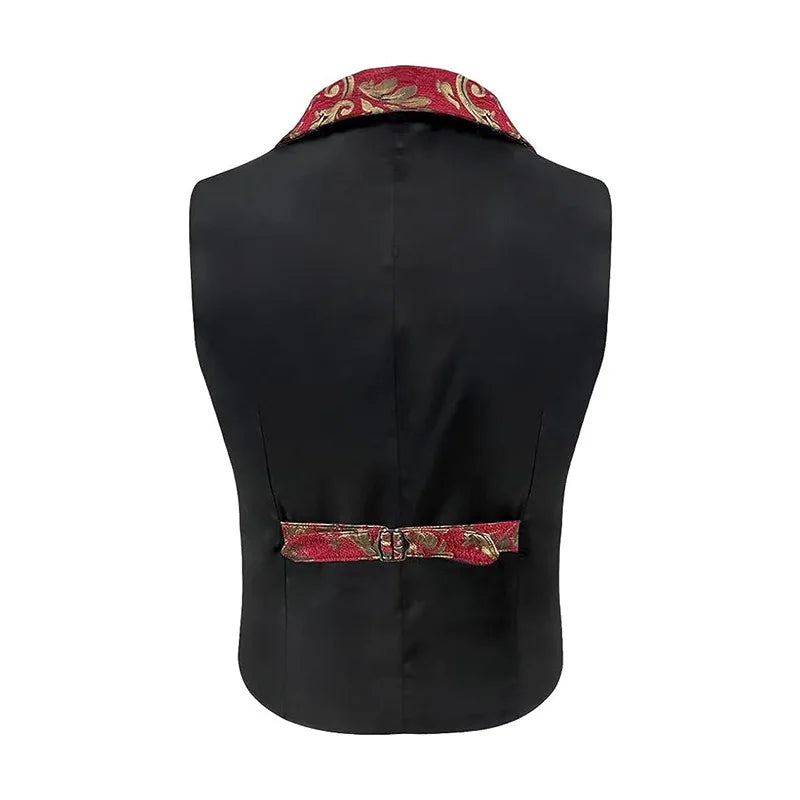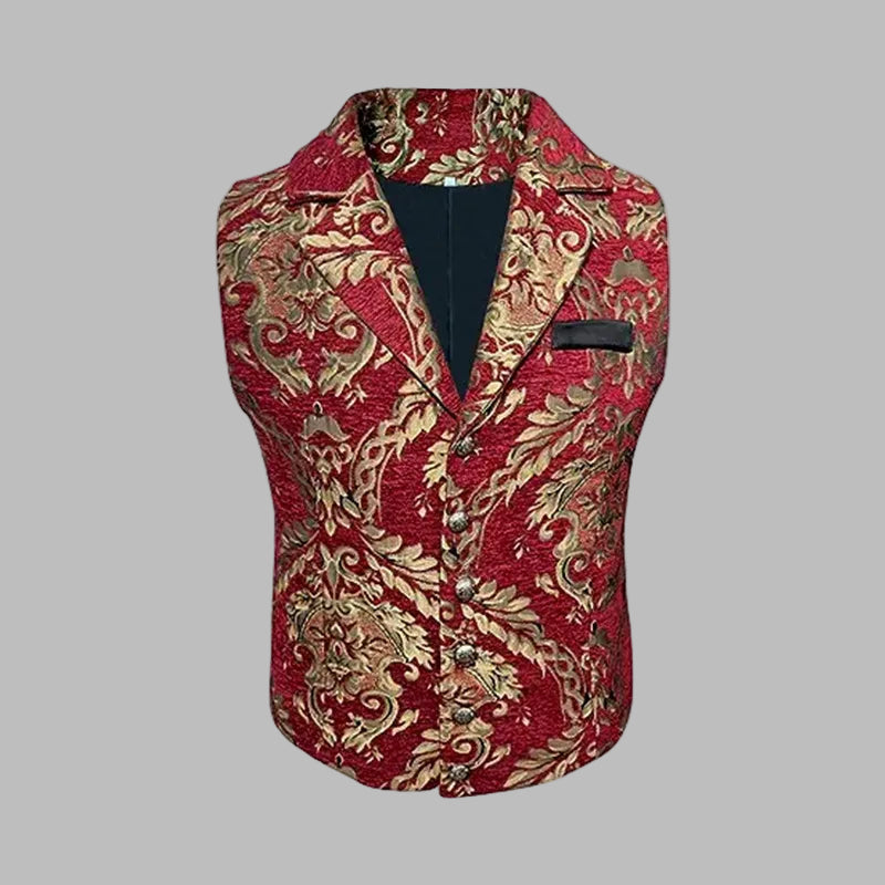 Colete Elegante Steampunk de Brocado Vermelho e Dourado