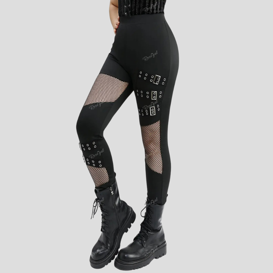 Leggings Punk Metal Pretos com Rede e Fivelas