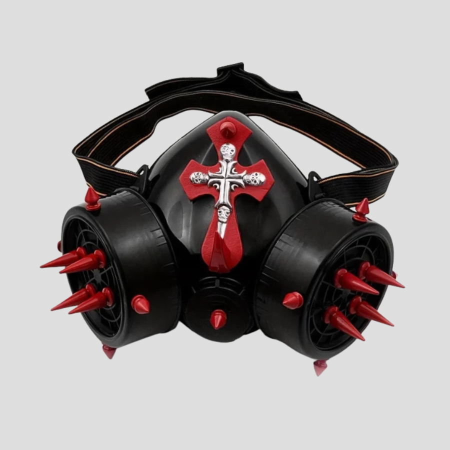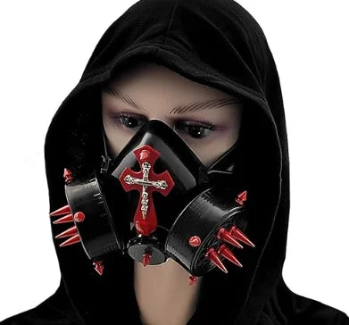 Máscara Preta de Metal com Cruz Vermelha e Tachas