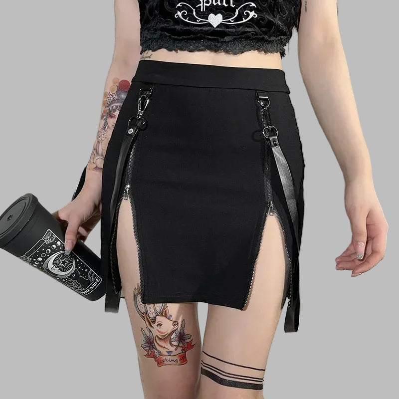 Mini saia gótica preta com fechos e tiras straps