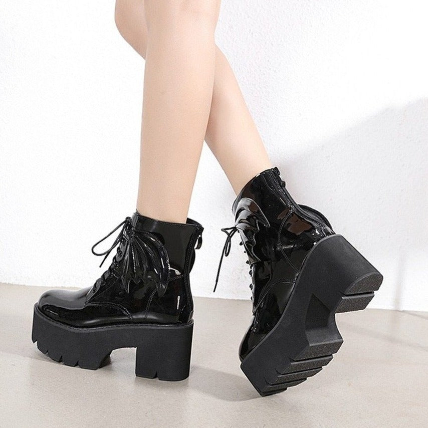 - Material: pele envernizada, poliuretano liso (imitação de pele), metal, borracha