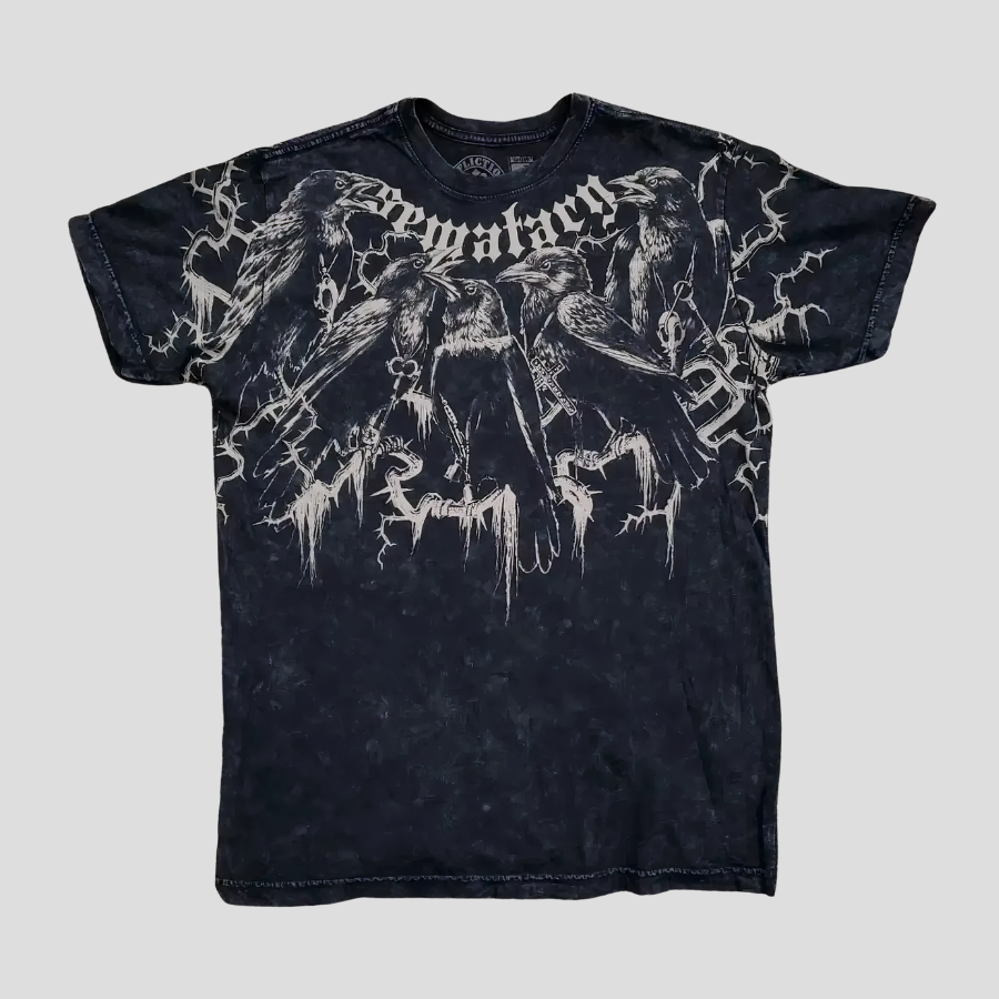 T-shirt Punk Metal com Corvos e Inscrição Preto