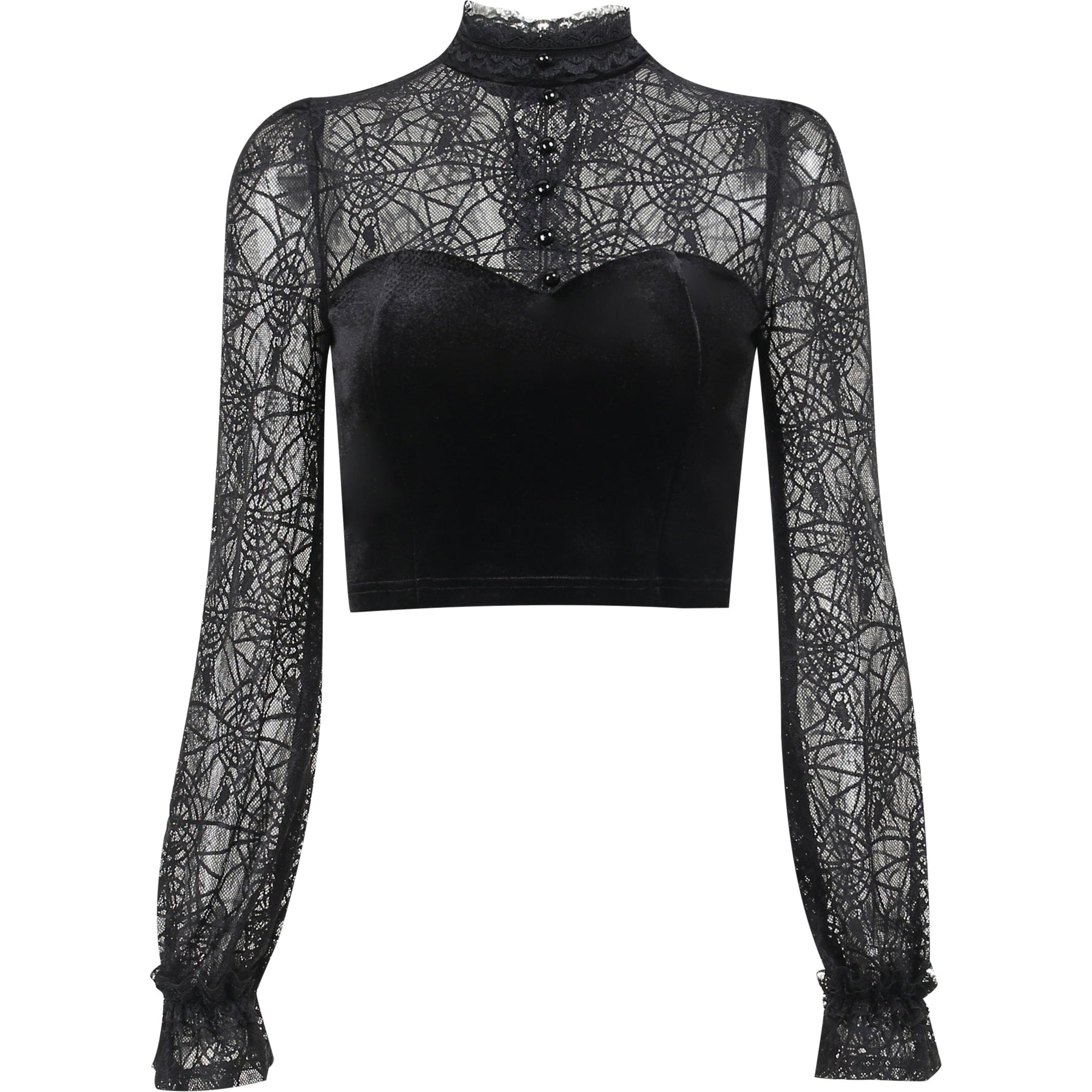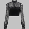 Projetado para os ousados e destemidos, o nosso Top Gótico adapta-se às suas formas, destacando-as. O decote em V adiciona um toque de mistério, enquanto os detalhes em renda e franzidos conferem uma elegância sensual. O seu material de veludo é ligeiramente elástico, garantindo conforto e estilo enquanto expressa a sua singularidade.