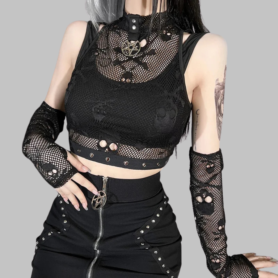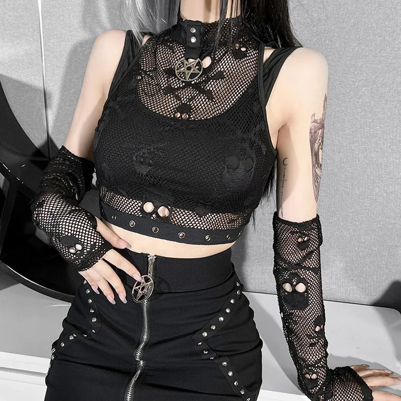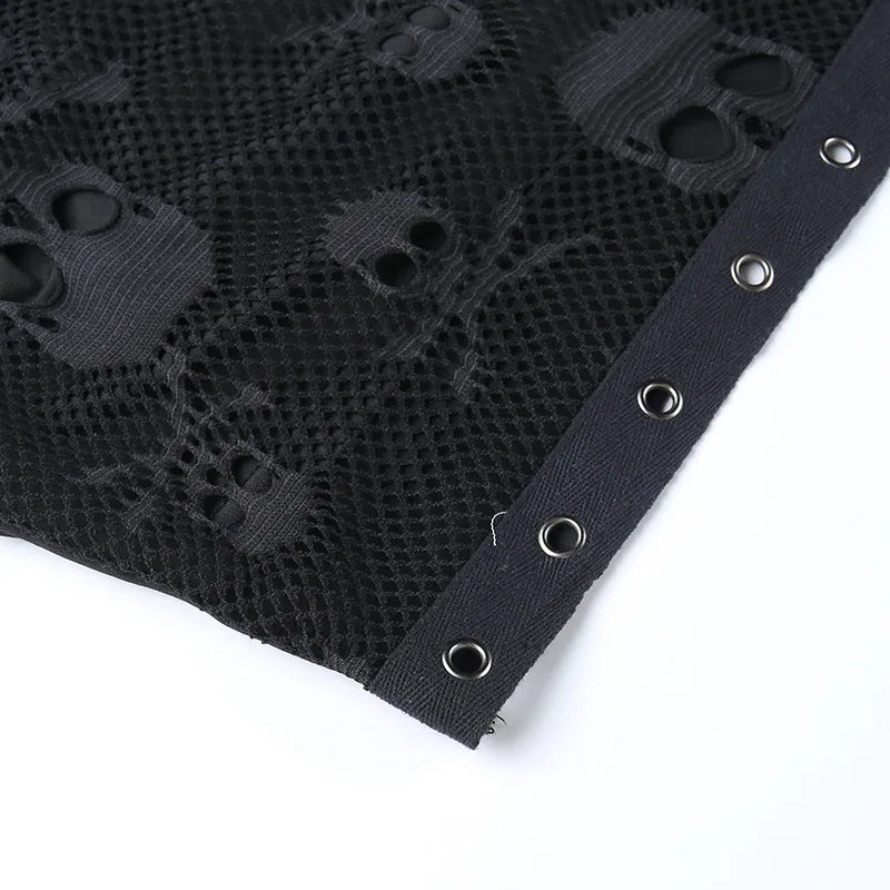 Top Gótico Preto de Malha com Estampa de Caveira e Mangas de Rede