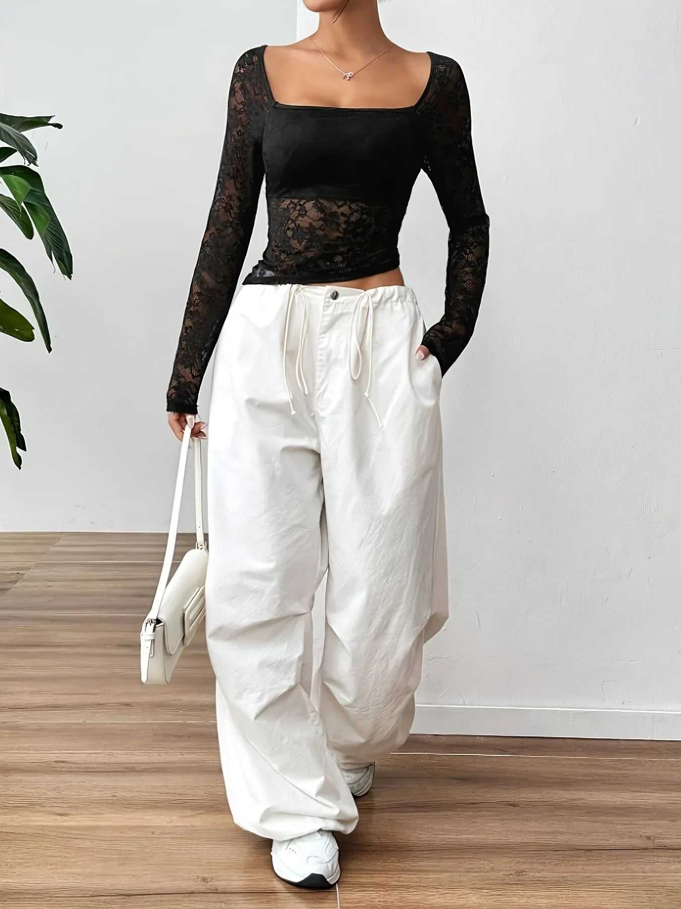 Top Ajustado Preto de Renda Transparente com Mangas Compridas