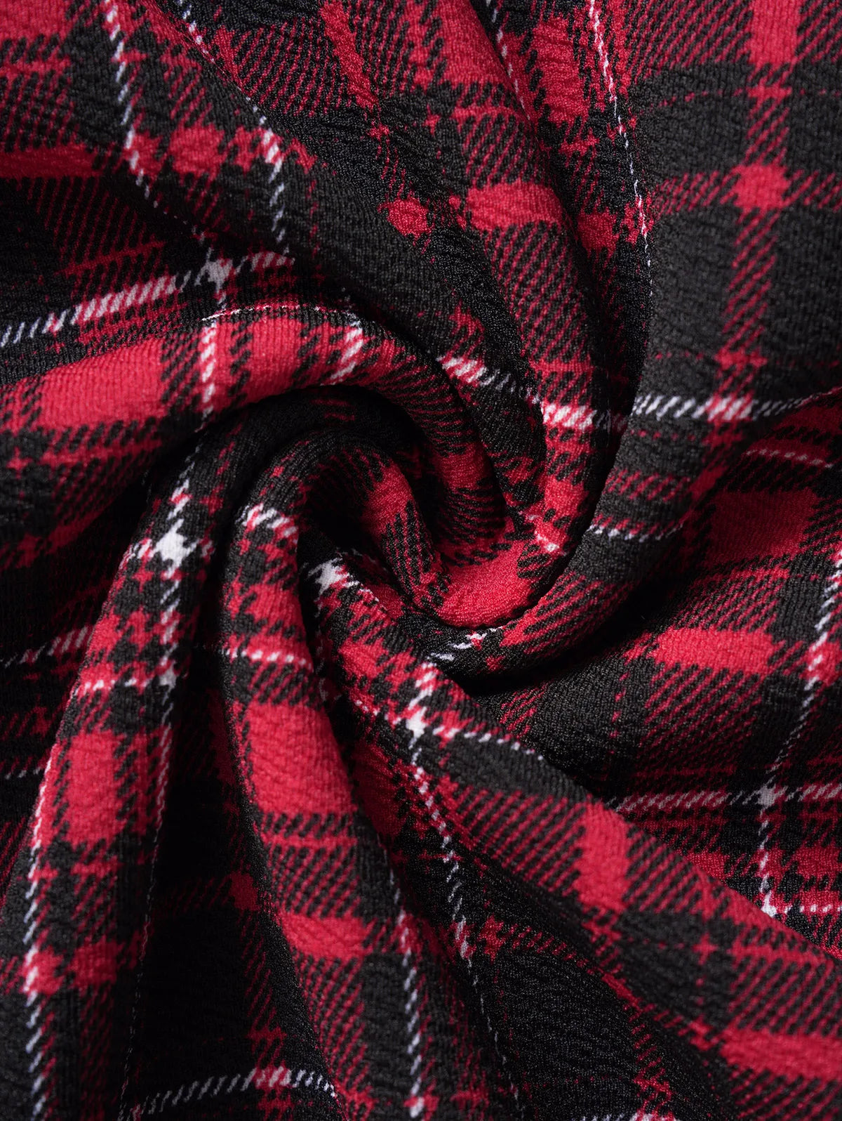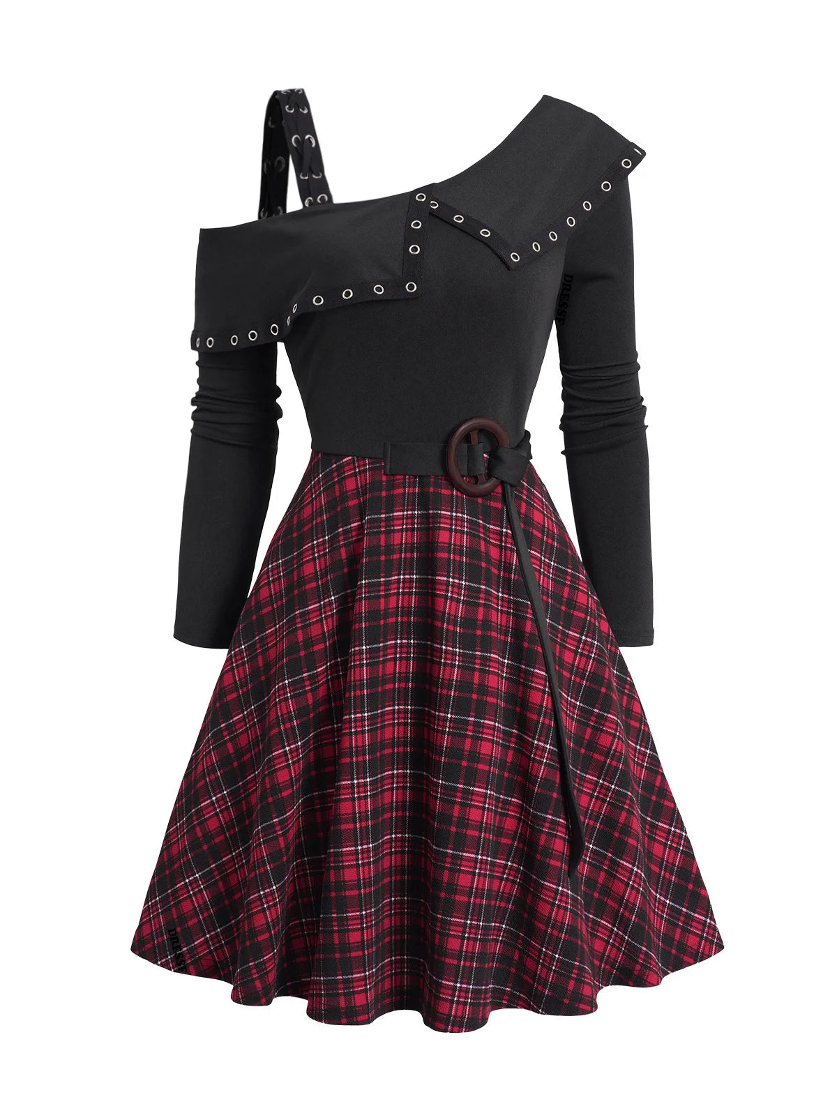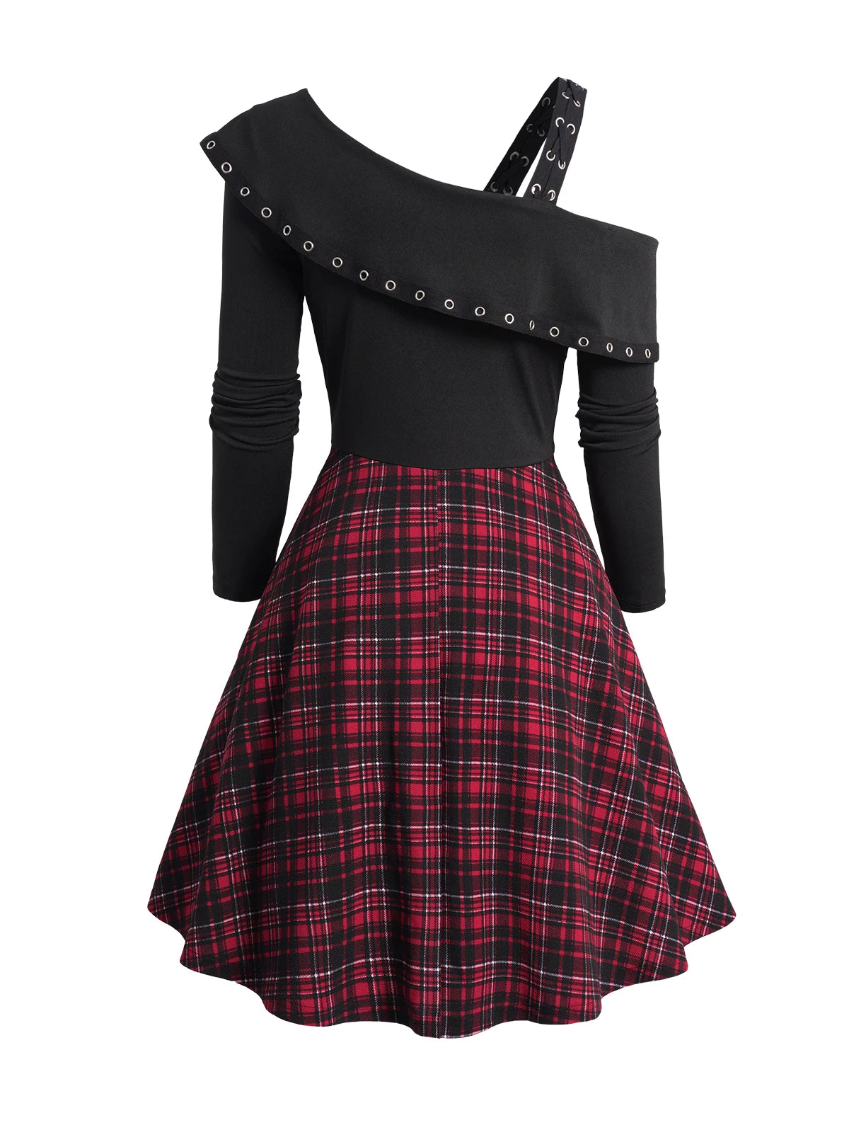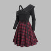 Vestido Assimétrico Preto Xadrez Vermelho Estilo Punk