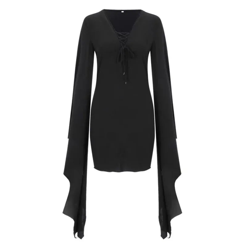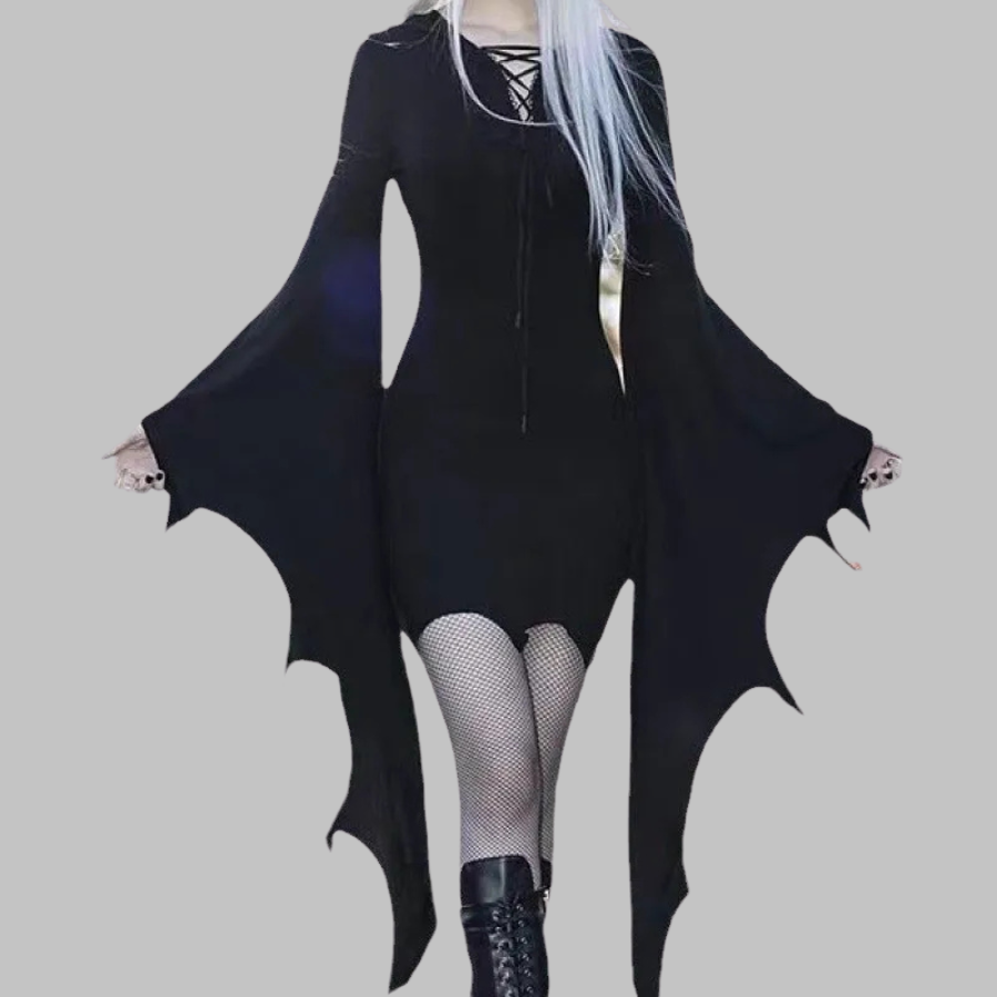 Vestido gótico preto com mangas em forma de asas de morcego