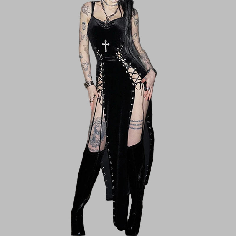 Vestido gótico preto longo de veludo com aberturas e cruz