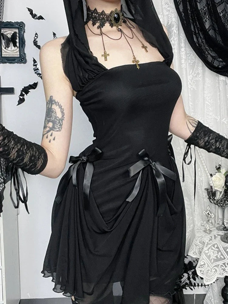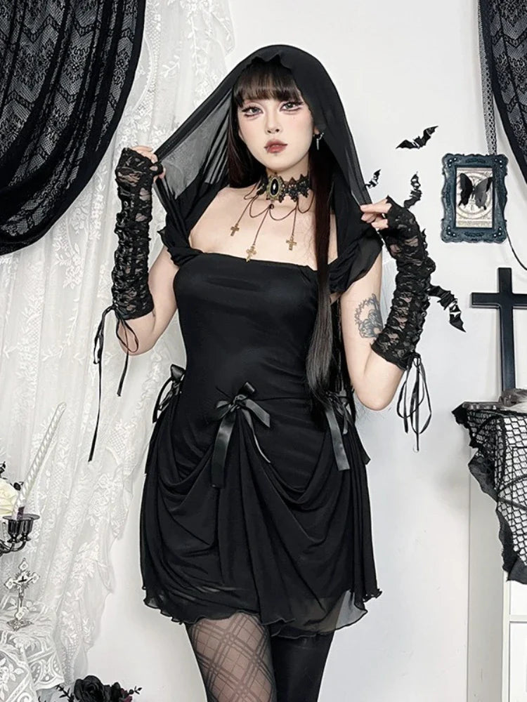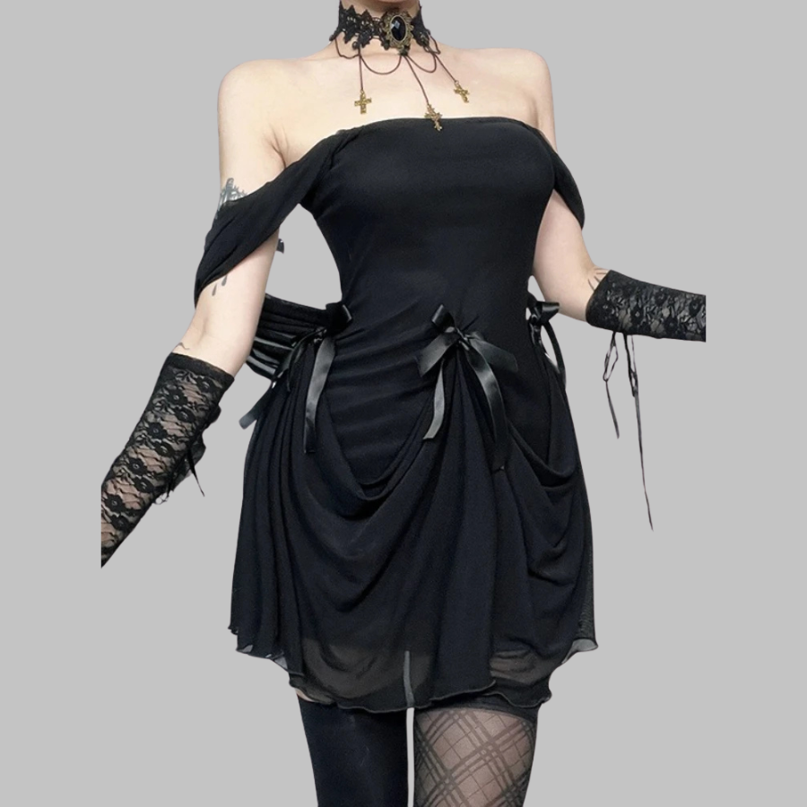 Vestido grunge preto com mangas compridas e saia drapeada
